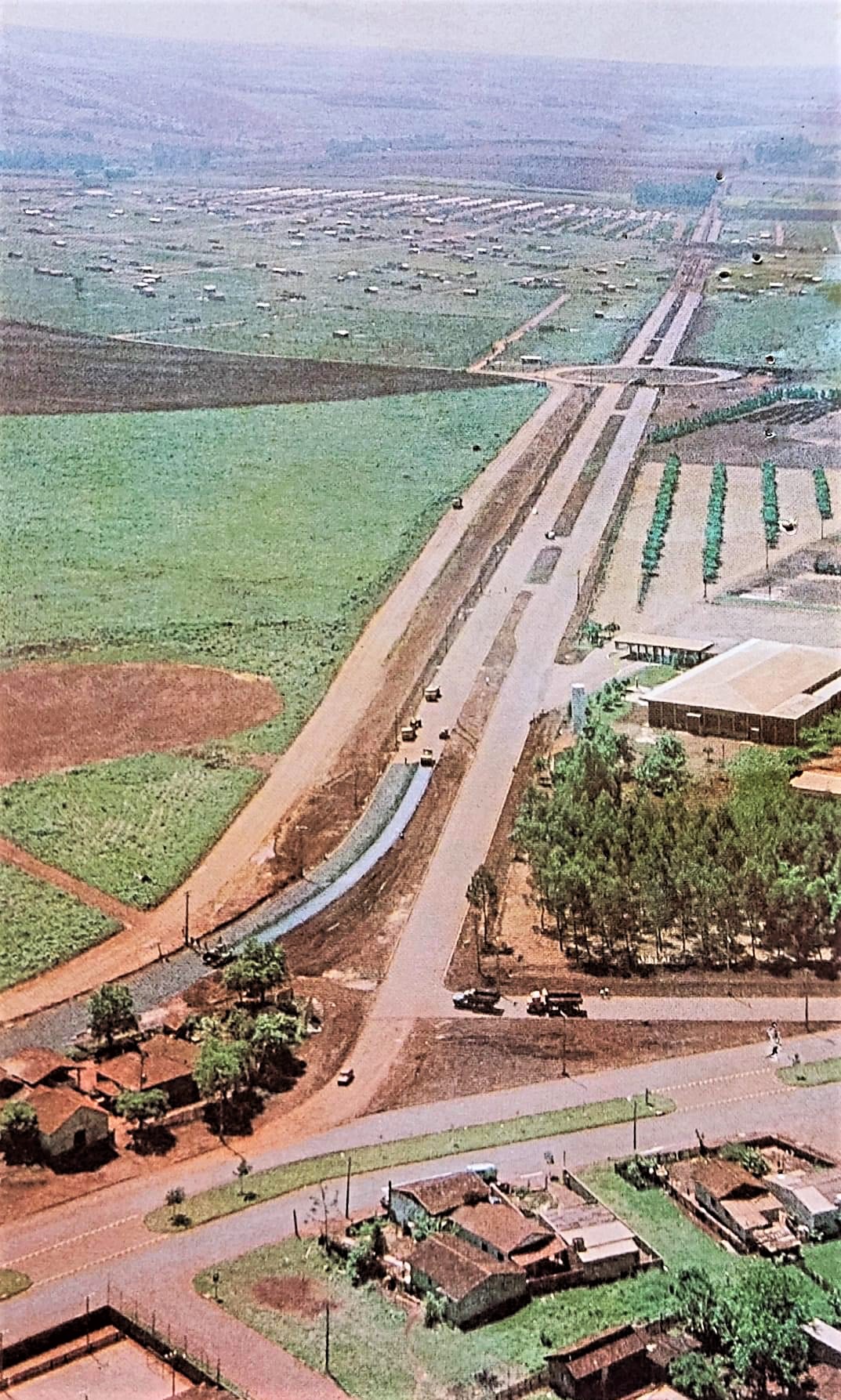 Encontro da avenida Morangueira, na base da imagem, com a avenida Kakogawa, que estava em obras para a sua duplicação. O registro data da primeira metade dos anos 1980.