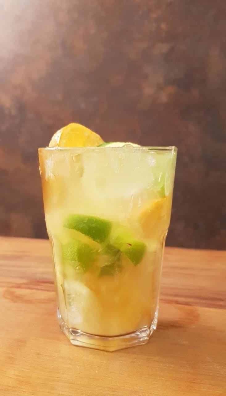 A bebida é feita com vodka, limão siciliano e limão thaiti, além de ser adoçada com xarope de rapadura artesanal. A finalização fica por conta das lascas de rapadura.