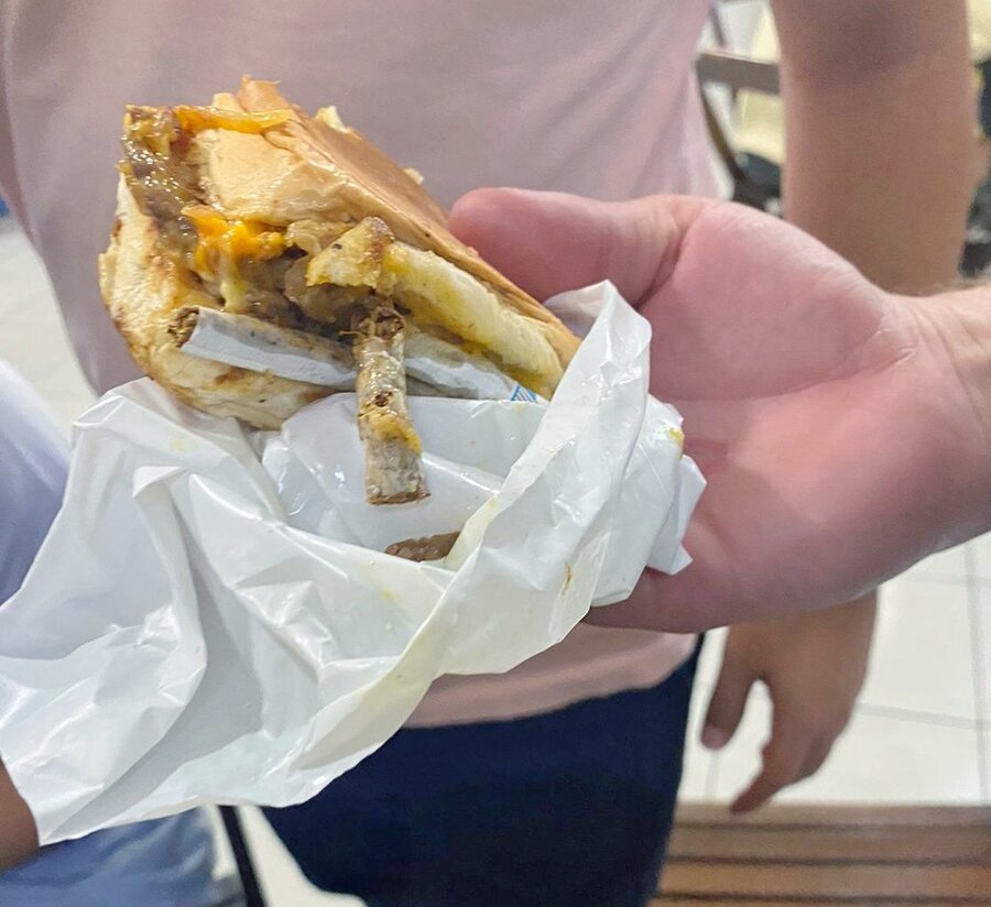 “Pedi o meu lanche cortado ao meio. Quando chegou, peguei a metade e dei duas mordidas. Depois disso fui arrumar o saquinho plástico e nisso vi um negócio estranho, que eram os dois cigarros. Fui questionar eles sobre isso, eles me devolveram o dinheiro e fizeram outro lanche, porém todos da mesa ficaram com receio de comer novamente. Mas em nenhum momento o estabelecimento quis saber como aconteceu e não questionou nenhum funcionário”, relatou.