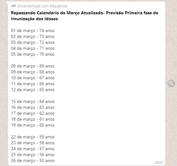 Em fevereiro, circulou nas redes sociais e em grupos de WhatsApp um falso calendário de vacinação contra a covid-19 em Maringá. A mensagem, que viralizou, dizia que idosos entre 55 e 74 anos receberiam a dose entre os dias 1º e 22 do março – cada faixa etária em uma data.
