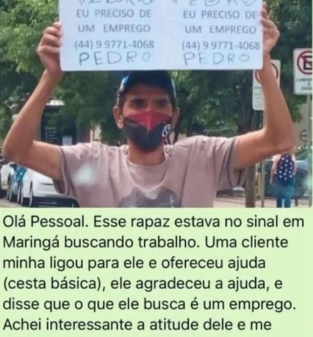 O primeiro contato da colega de Raiza foi para oferecer ajuda com uma cesta básica ao homem que pedia emprego no semáforo, em Maringá, mas ele não aceitou e enfatizou que o buscava mesmo era uma oportunidade de trabalho. Ela, então, compartilhou uma foto do homem segurando o cartaz em um grupo de profissionais de Recursos Humanos. E foi por meio desta mensagem que Raiza o conheceu.
