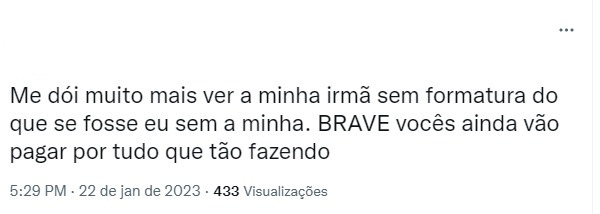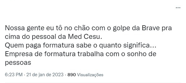 “A BRAVE FORMATURAS, em consonância com seus princípios e valores, vem a público esclarecer os fatos relacionados ao evento ocorrido na data de 19.01.23 (Jantar de Formatura) e o que irá ocorrer nesta, 20.01.23 (Colação de Grau), respectivamente, bem como, o evento agendado para amanhã, dia 21 de janeiro, na cidade Maringá/PR. Considerando que cada projeto para realização de eventos de formatura tem orçamento próprio e gestão individualizada; Considerando que chegou a informação a esta empresa, nos últimos dias, que formandos desta turma, passaram a entrar em contato diretamente com os fornecedores e prestadores de serviços da Brave, relacionados aos eventos agendados para as datas acima, questionando as contratações já realizadas; Considerando que, após os contatos acima mencionados, tais fornecedores e prestadores de serviços, passaram a destratar e/ou modificar as condições de pagamento das prestações de serviços já contratadas, alterando todo o fluxo anteriormente definidos; Considerando ainda, que diante de tais condições impostas, somada ao déficit de projeto desta turma, que atinge saldo devedor superior a 530 mil reais, já com ciência dada em datas anteriores, inclusive com diversas sugestões não acatadas; Considerando ainda, o compromisso de transparência nas suas ações, buscando equacionar os percalços aludidos e repisados na reunião ocorrida hoje as 13 horas, pelo representante jurídico da Comissão de Formatura; E na intenção incansável desta empresa de buscar atingir seus propósitos, assim ofereceu como possível solução: