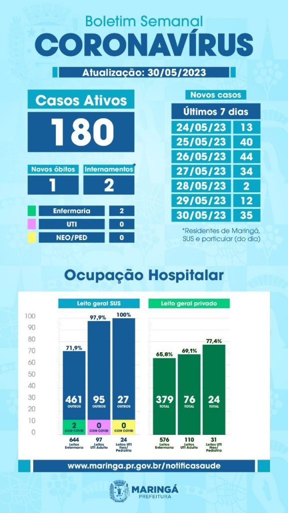 Desde o início da pandemia, Maringá soma 159.958 casos confirmados de covid-19. Desses, 157.913 já estão recuperados, 113 são casos ativos (pacientes em isolamento domiciliar ou internados) e 1.855 morreram por complicações da doença.