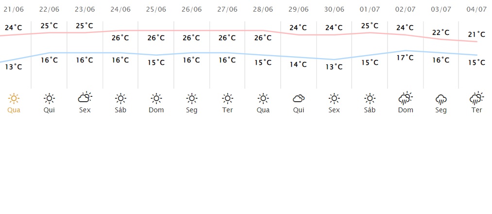 Em Maringá, segundo o Simepar, o primeiro dia do inverno deve ser marcado por predomínio de sol, com mínima de 13ºC e máxima de 24ºC. Os dias seguintes deverão ter temperaturas mínimas e máximas inclusive mais altas do as que têm sido registradas nos últimos dias de outono – veja abaixo a previsão para os próximos dias na cidade, de acordo com o Simepar.