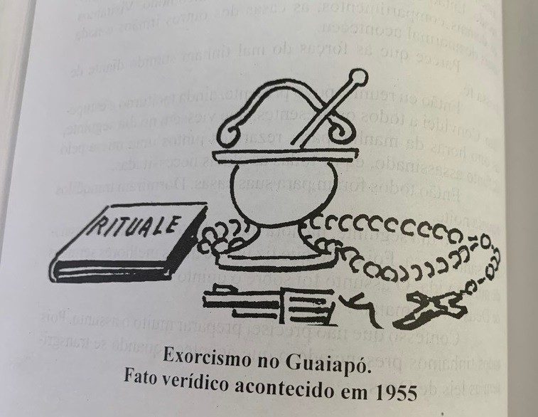 Perplexo, confesso que um estranho sentimento invadiu todo o meu ser. Prevenido porém, e avisado antes, com profunda fé no coração, acenei a meu sacristão que me alcançasse o meu Rituale do Exorcismo. Ele obedeceu. Estava porém tremendo e mal conseguia segurar a água benta. Foi então que pus em prática, o que tinha aprendido no meu curso de Teologia e Pastoral. Acredito que nunca rezei com tanta fé no coração. Sentia-me muito perto desse estranho fenômeno. Sei que o esconjurei em nome de Deus. Pedi paz para aquele povo e sossego para aquele lugar. Com a cruz na mão, arpergia a água benta, pedia a Deus a benção para o meu povo. E tudo aquietou