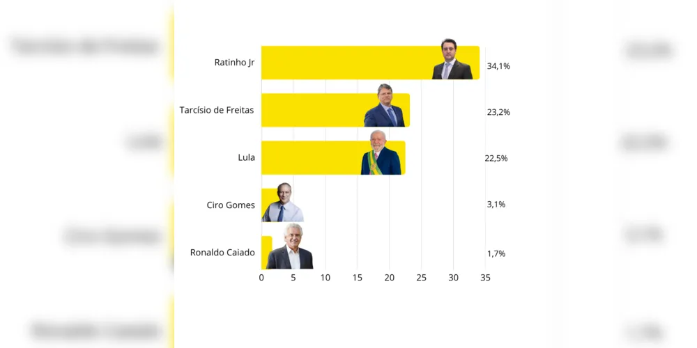PRIMEIRO TURNO – O primeiro cenário apresentado foram as intenções de voto durante o 1º Turno das eleições para presidente no Paraná. Neste cenário, Ratinho Jr. aparece liderando com 34,1% dos votos, seguido de Tarcisio de Freitas, com 23,2% e Lula, com 22,5%. Completam a lista Ciro Gomes, com 3,1%, e Ronaldo Caiado, com 1,7%. ‘Não Sabe’ representam 8,5% e ‘Brancos e Nulos’ são 6,9%.