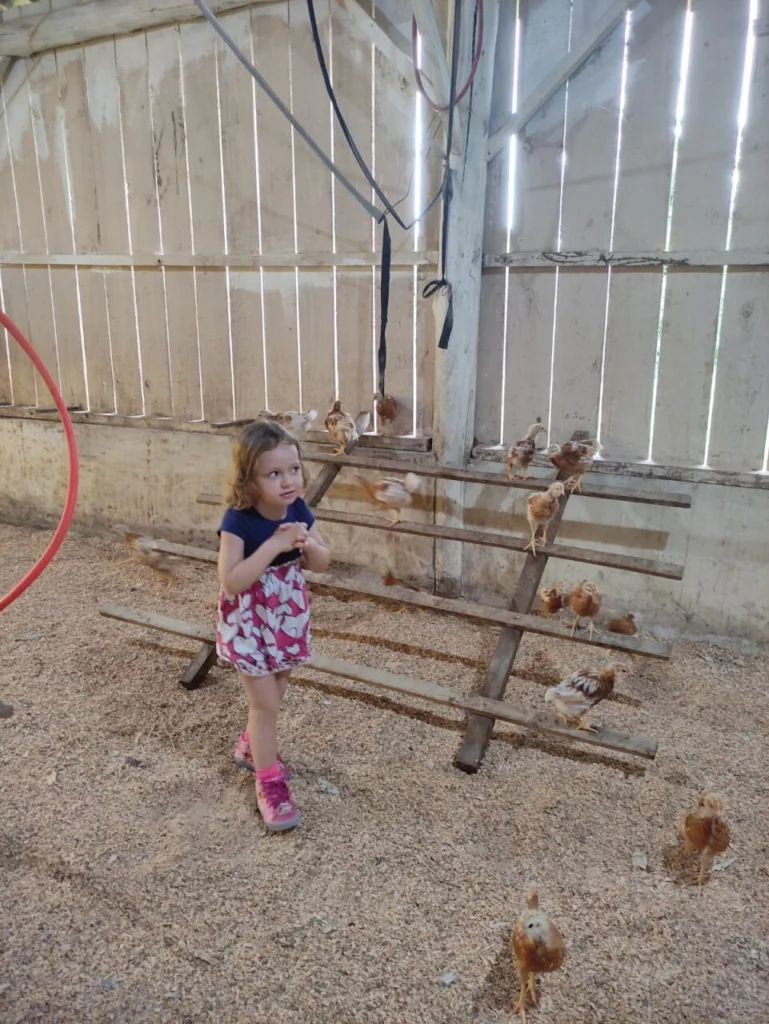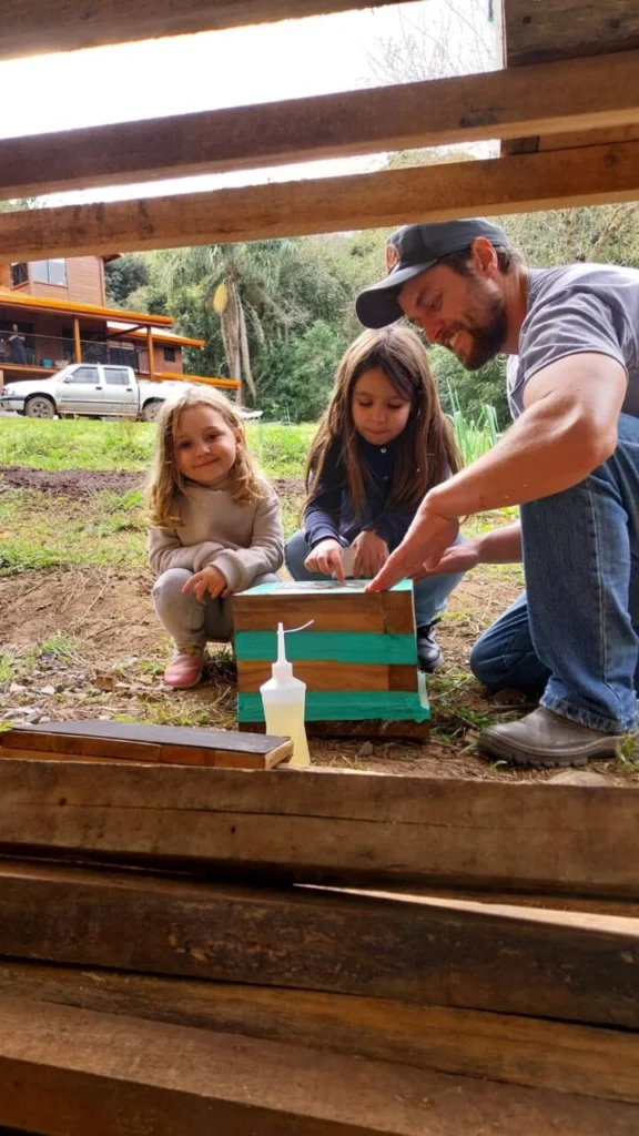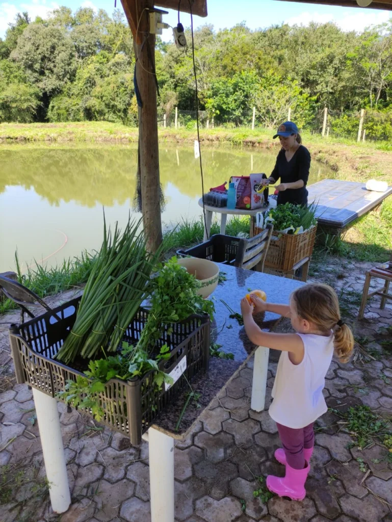 “Nós tentamos envolver ela o máximo possível nas nossas atividades. Quando ela era bebê já ajudava a colher ovos, também auxiliou nos cuidados iniciais com pintainhas e na colheita de verduras. Também ajuda a cuidar dos cachorros, adora as abelhas sem ferrão que estamos criando, além de gostar de tomar o mel e brincar no trator”, diz.
