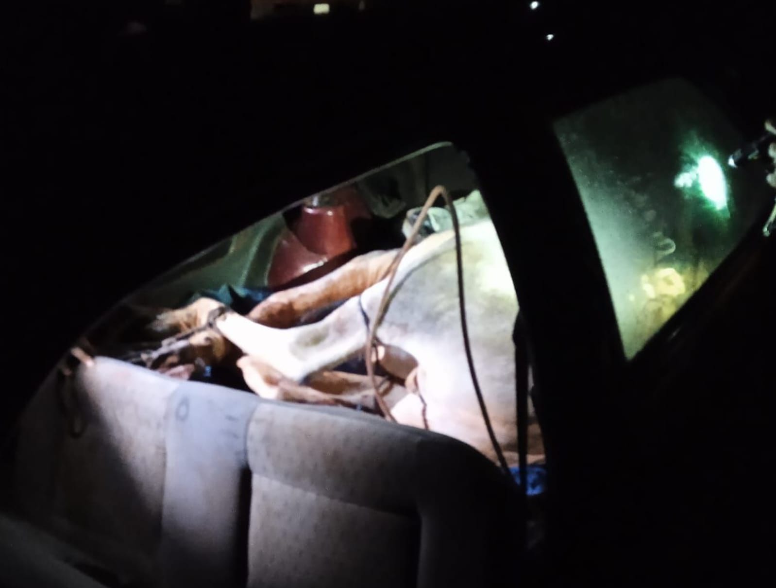 O motorista recebeu ordem, não obedeceu e fugiu em direção a rodovia. Ele abandonou o veículo, e para a surpresa dos policiais, o animal foi encontrado amarrado e deitado entre o porta-malas e o banco traseiro rebatido.