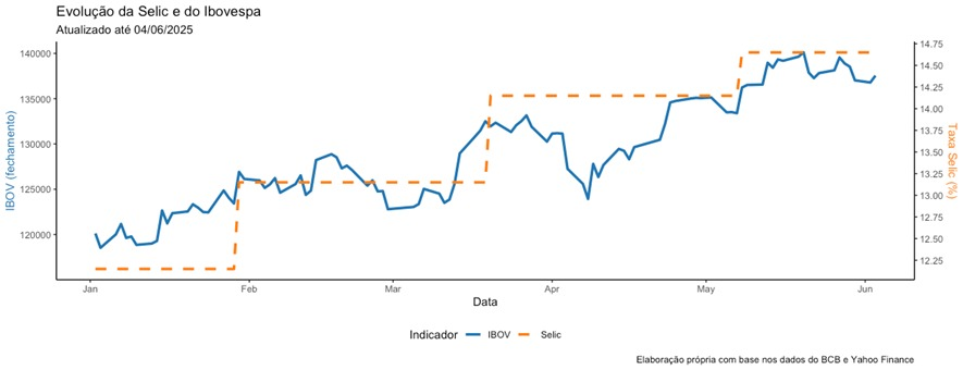 A elevação da taxa básica de juros (Selic) de 12,25% em dezembro de 2024 para 14,75% em maio de 2025, decidida pelo Banco Central, poderia indicar um freio no mercado. Contudo, o índice manteve sua trajetória de alta, desafiando expectativas. Apesar disso, o cenário fiscal ainda preocupa: o governo projeta um déficit de R$ 88 bilhões para 2025, o que pode exigir cortes ou ajustes que impactem negativamente o desempenho das empresas listadas. A figura 2 reflete a evolução da Selic e do Ibovespa.