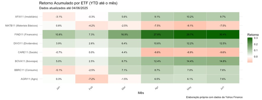 Para entender o comportamento dos setores da economia, é possível observar o desempenho de ETFs — fundos de índice que representam carteiras de ações específicas. No primeiro semestre de 2025, os resultados foram diversos
