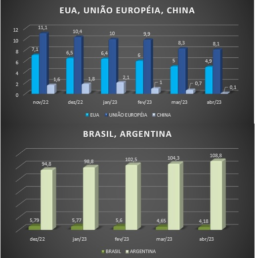 Com relação aos principais parceiros comerciais do Brasil, a China apresenta uma expectativa de crescimento de 4,3% e 5% em 2023 e 2024. Já para os EUA e México a previsão é de um crescimento abaixo de 1%, em 2023 e 1,56% e 2,3% em 2024, respectivamente.