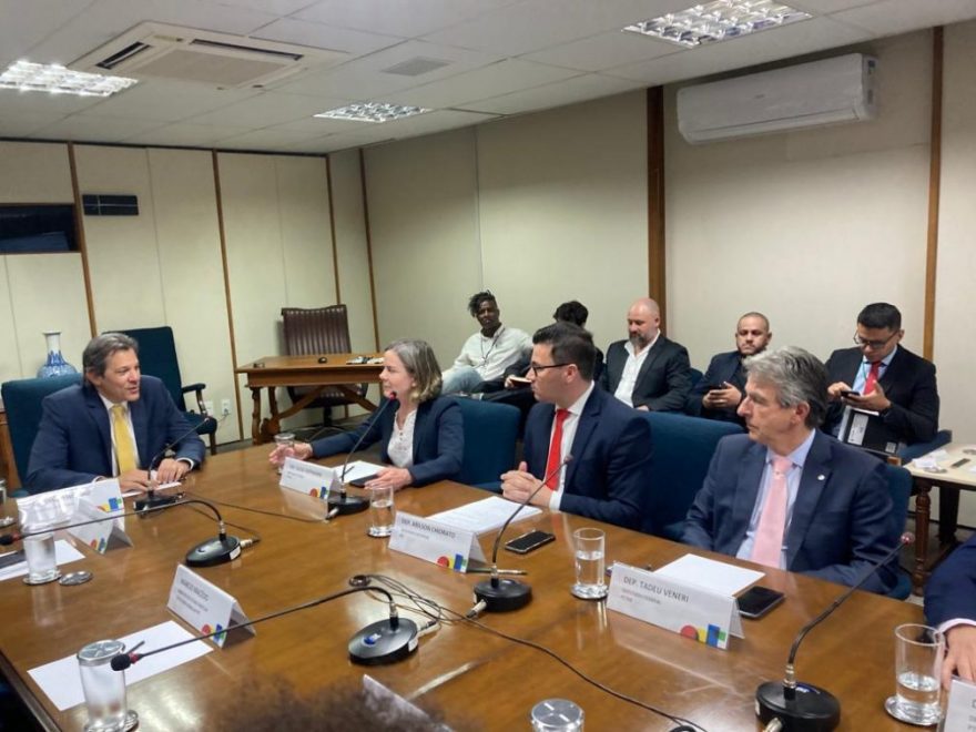 O deputado Arilson Chiorato (PT), coordenador da Frente Parlamentar das Estatais e Empresas Públicas, acompanhado da deputada federal e presidenta nacional do Partido dos Trabalhadores, Gleisi Hoffmann, liderou uma comitiva com representantes de diferentes setores sindicais durante encontro com o ministro da Fazenda, Fernando Haddad.