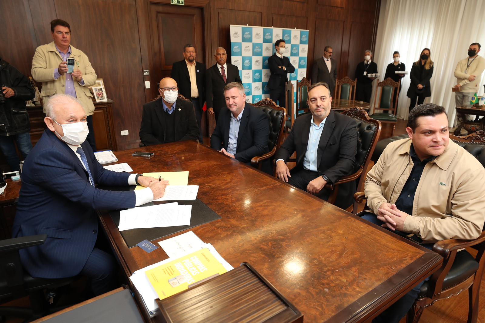 Os deputados Fernando Francischini, Do Carmo, Emerson Bacil e Cassiano Caron retornaram à Assembleia Legislativa do Paraná, nesta segunda-feira (06).O presidente da Casa, deputado Ademar Traiano (PSD), cumprindo decisão do Supremo Tribunal Federal (STF) reconduziu os parlamentares aos cargos. Os quatro parlamentares haviam sido afastados por decisão do Tribunal Superior Eleitoral (TSE) em outubro de 2021 e foram reconduzidos aos cargos por liminar proferida pelo ministro Kassio Nunes Marques na última semana.A assinatura ocorreu na sala do presidente e teve a presença do primeiro secretário da Assembleia, deputado Luiz Claudio Romanelli (PSD).