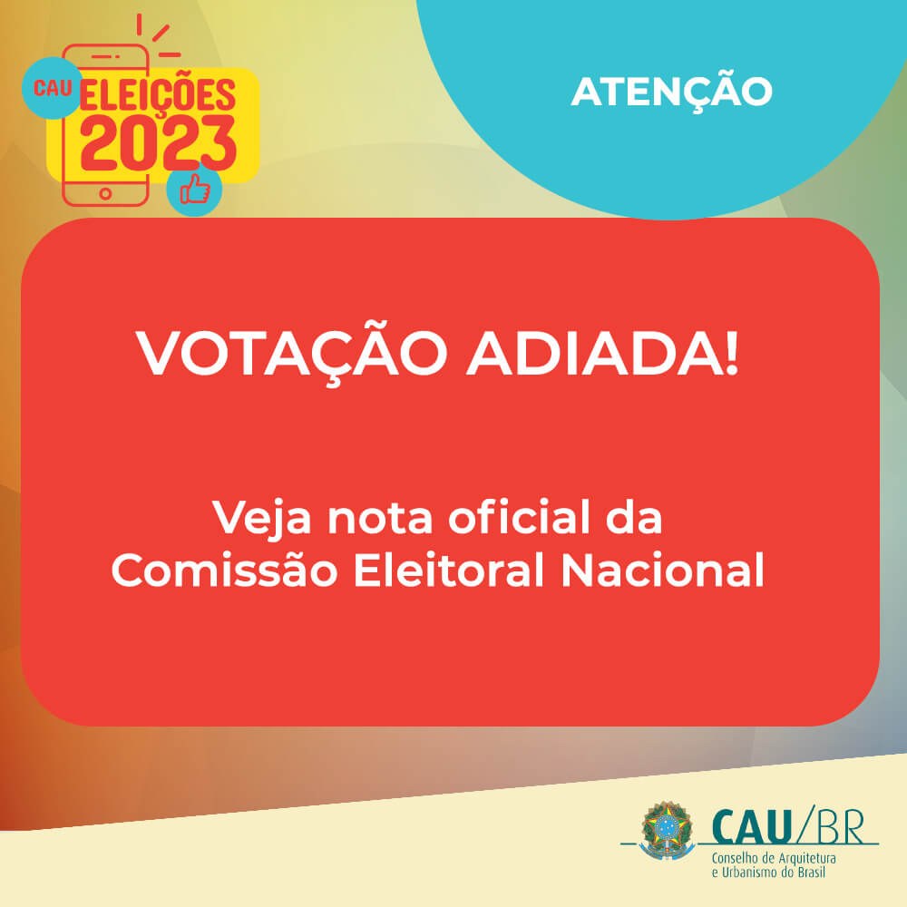 A eleição para o Conselho de Arquitetura e Urbanismo (CAU), previstas para ontem, foram adiadas. A Comissão Eleitoral Nacional tomou a decisão em razão da instabilidade registrada no sistema de votação “VotaOnline” disponibilizado pelo Tribunal Regional Eleitoral do Tocantins (TRE-TO). Até 15h, menos de 10% dos eleitores aptos a votar haviam conseguido concluir o procedimento.