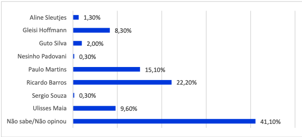 Se o Senador Sérgio Moro (UNIÃO) fosse cassado, os eleitores de Maringá ainda preferem Ricardo Barros (PP) como candidato. É o que aponta o levantamento realizado pelo instituto Visão Intelligence, de Londrina (PR). O maringaense larga com 22,3% das intenções de voto. Eis os números: