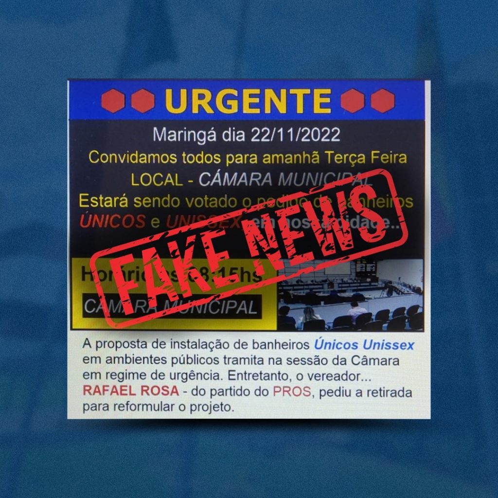 Em diversos grupos de WhatsApp de Maringá, uma “poderosa” fake news acabou sendo divulgada. Segundo a mensagem, os vereadores votariam amanhã, durante a sessão ordinária da Câmara, um projeto de lei “permitindo que banheiros únicos unissex” fossem adotados em toda a cidade. Conforme a fake news, o projeto entraria em debate em regime de urgência.