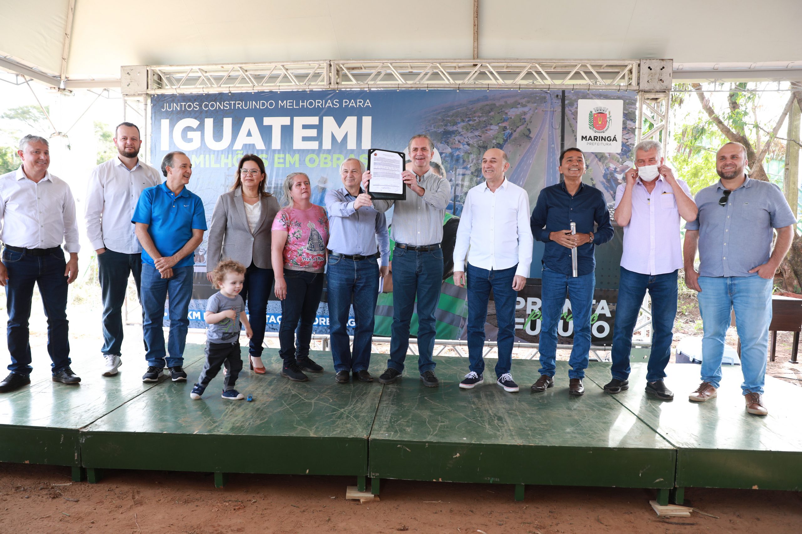 A Prefeitura de Maringá assinou uma ordem de serviço no distrito de Iguatemi. Na tarde desta quarta-feira, 6, a assinatura para pavimentação de trecho de 1,7 quilômetro, implantação de passeio público e drenagem pluvial no bairro Residencial Iguatemi, popularmente conhecido como Capelinha. O investimento é de R$ 3 milhões.