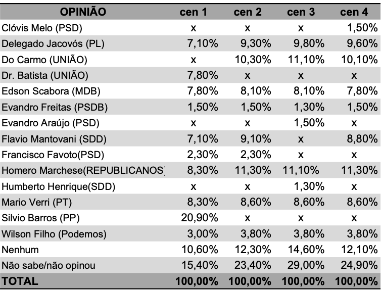 Depois da ampla divulgação em grupos de aplicativos de mensagens e em redes sociais da pesquisa de intenção de voto realizada pela Visão Intelligence, novos cenários também foram ventilados. Em outras três simulações, há a inclusão e retirada de nomes que podem disputar o pleito. Sem o pré-candidato Silvio Barros (PP), é Homero Marchese (REP) quem lidera a disputa em dois cenários, empatando na simulação 3 com o deputado estadual Paulo Rogério Do Carmo (UNIÃO).