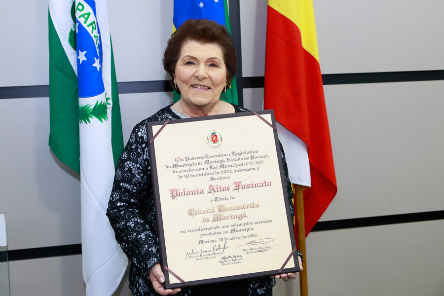 A Câmara de Maringá homenageou a professora aposentada, mãe, avó, bisavó, musicista Polônia Altoé Fusinato com o título de Cidadania Benemérita por proposição da vereadora Ana Lúcia Rodrigues. Amigos, companheiros de trabalho e de coral, alunos, familiares e autoridades prestigiaram a solenidade realizada na noite desta quinta-feira (6).