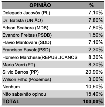 A apresentação dos resultados, além do geral, segue por regiões, sexo, idade, escolaridade e renda. Foi utilizada uma amostra de 600 eleitores, com margem de erro foi de 4,5% para mais e 4,5% para menos, com um grau de confiança de 95%. Os dados da pesquisa foram coletados nos dias 29, 30 e 31 de agosto de 2.023.
