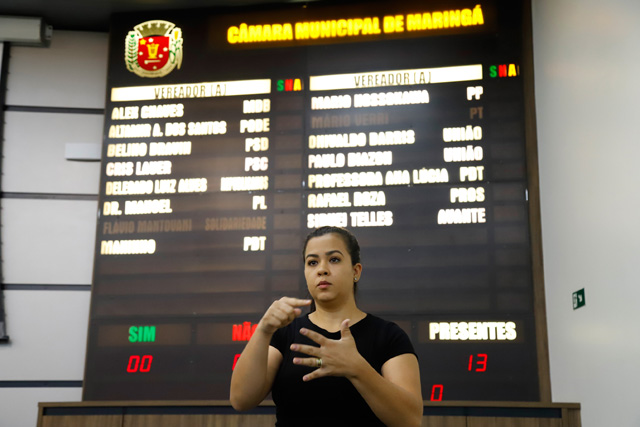 A sessão da Câmara de Maringá de ontem (2) foi realizada com a presença dos 15 vereadores. Pela primeira vez as falas foram traduzidas, simultaneamente, para a Língua Brasileira de Sinais (Libras). E quem realizou a tradução foram dois intérpretes voluntários da Faculdade Eficaz, a título de teste. O objetivo é gerar a inclusão social e estimular a participação popular.