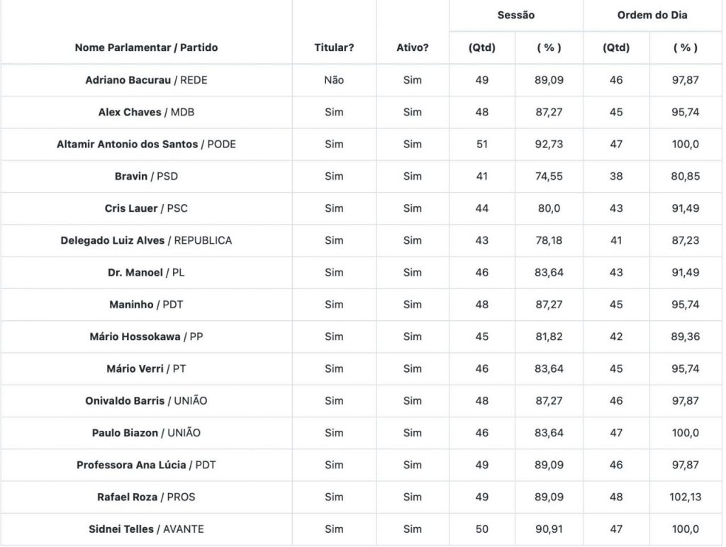 A tabela mostra que, em termos absolutos, o vereador Bravin (PSD) foi o que menos esteve presente na ordem do dia das sessões, com 80,85% de presença. No entanto, em muitos casos, o vereador registra a presença verbalmente, o que pode ter acarretado este número. Quatro vereadores confirmaram presença total: Altamir da Lotérica (PODE), Biazon (UNIÃO), Rafael Roza (SDD) e Sidnei Telles (AVANTE).