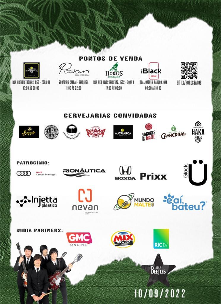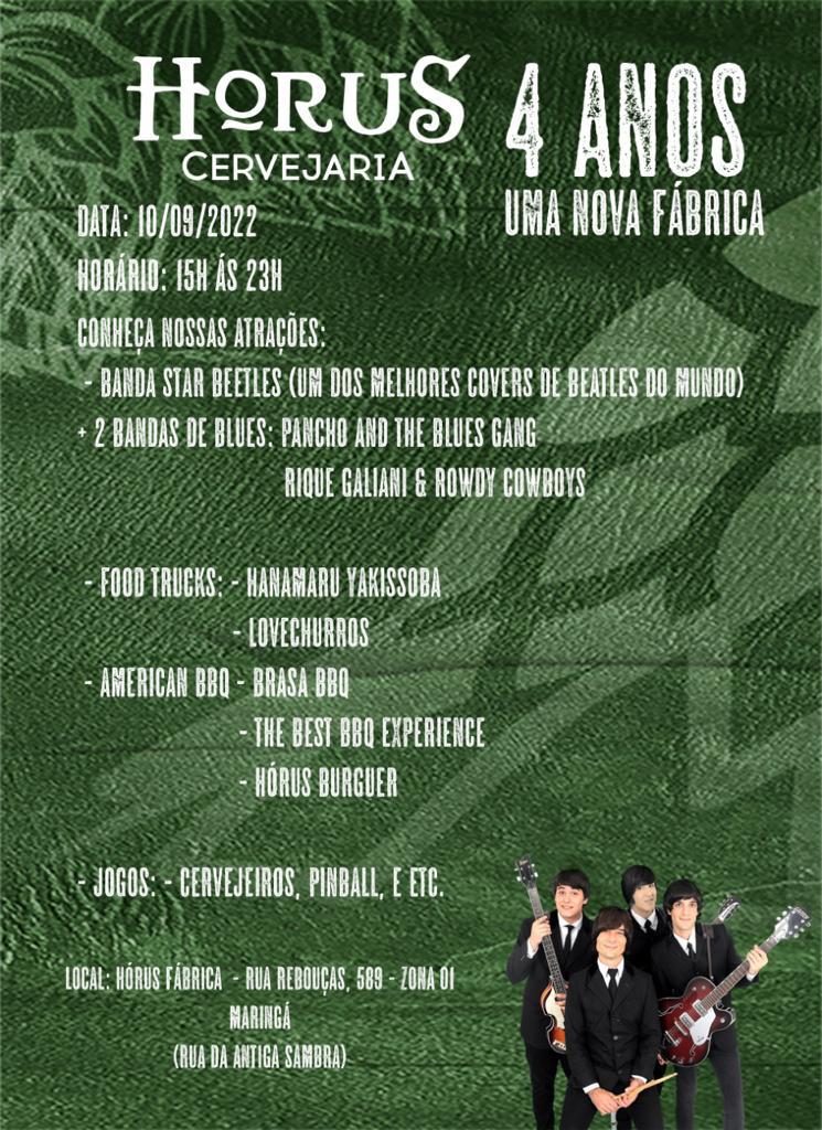 A Hórus Cervejaria, de Maringá, comemora neste sábado, 10, quatro anos de casa e também abrirá as portas de sua nova fábrica, na Avenida Rebouças, com diversas atrações. O evento será realizado das 15h às 23h. Os ingresso estão no segundo lote, com valor de R$ 60 + taxas, dão direito todas as atrações e um copo personalizado – veja abaixo os locais de compra.