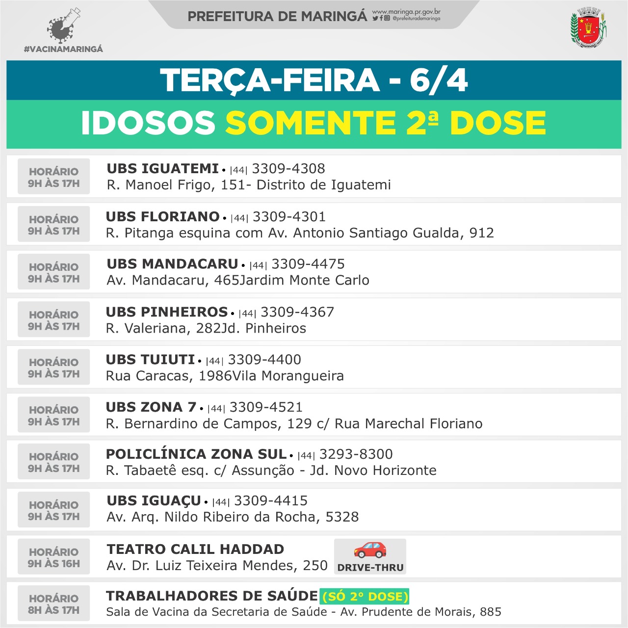 Sem previsão para chegada de novos lotes de vacinas, Maringá segue vacinando apenas os idosos que precisam receber a segunda dose nesta terça-feira. O mesmo vale para trabalhadores da saúde que já receberam a primeira dose do imunizante.