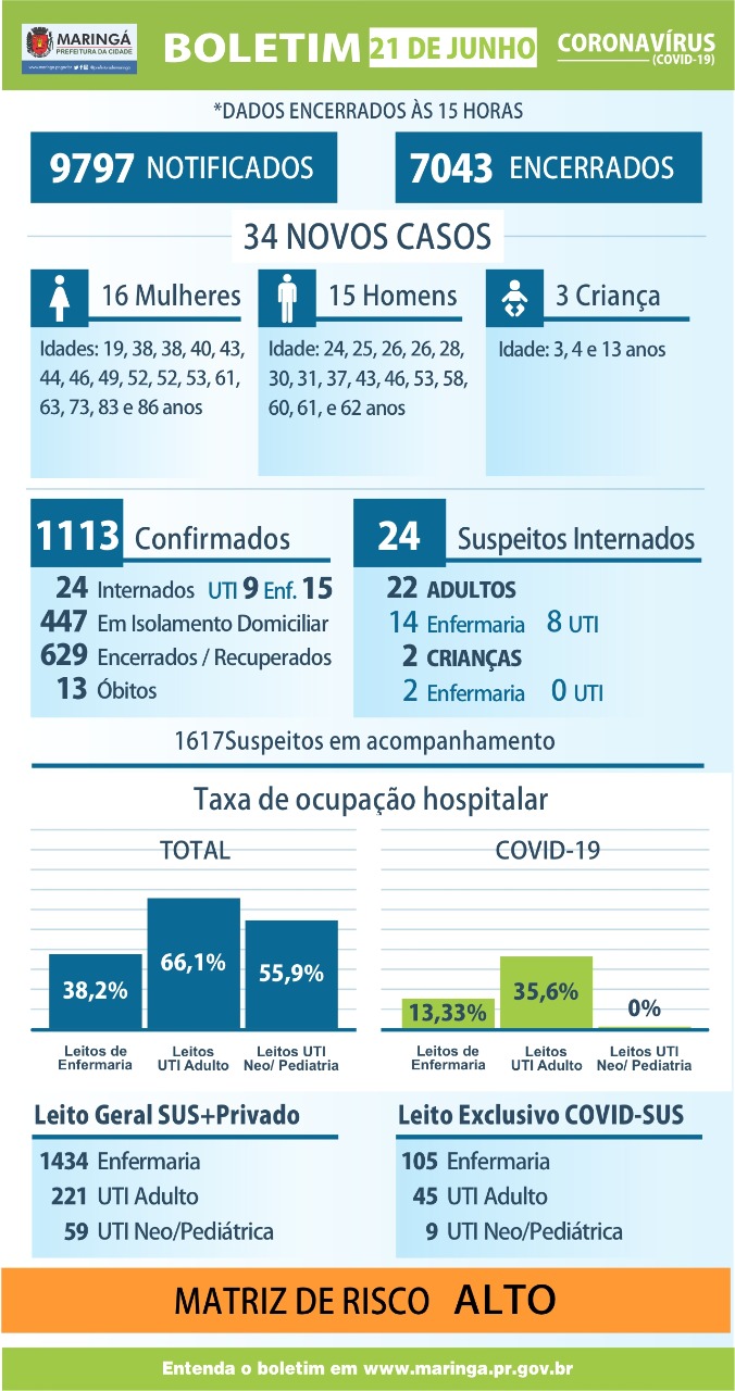 O boletim também informa que são 629 casos encerrados e 13 óbitos registrados em Maringá. No boletim de sábado, 20, eram 616 recuperados.