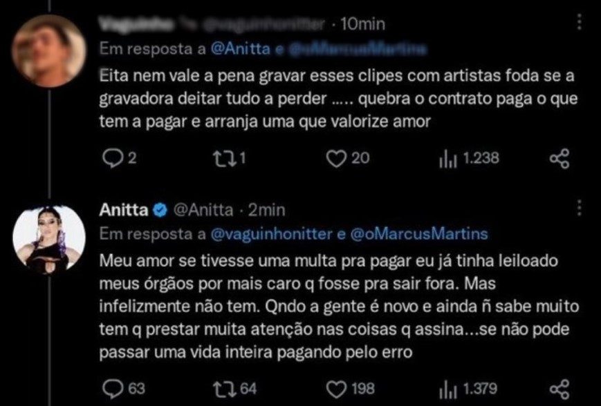 Em resposta a outro fã, que a incentivou fazer a quebra de contrato, Anitta reforçou o descontentamento, lamentando não ser possível romper com a gravadora. “Se tivesse uma multa pra pagar, eu já tinha leiloado meus órgãos, por mais caro que fosse, pra sair fora. Mas infelizmente não tem. Quando a gente é novo e ainda não sabe muito, tem que prestar muita atenção nas coisas que assina… se não pode passar uma vida inteira pagando pelo erro”, expôs.
