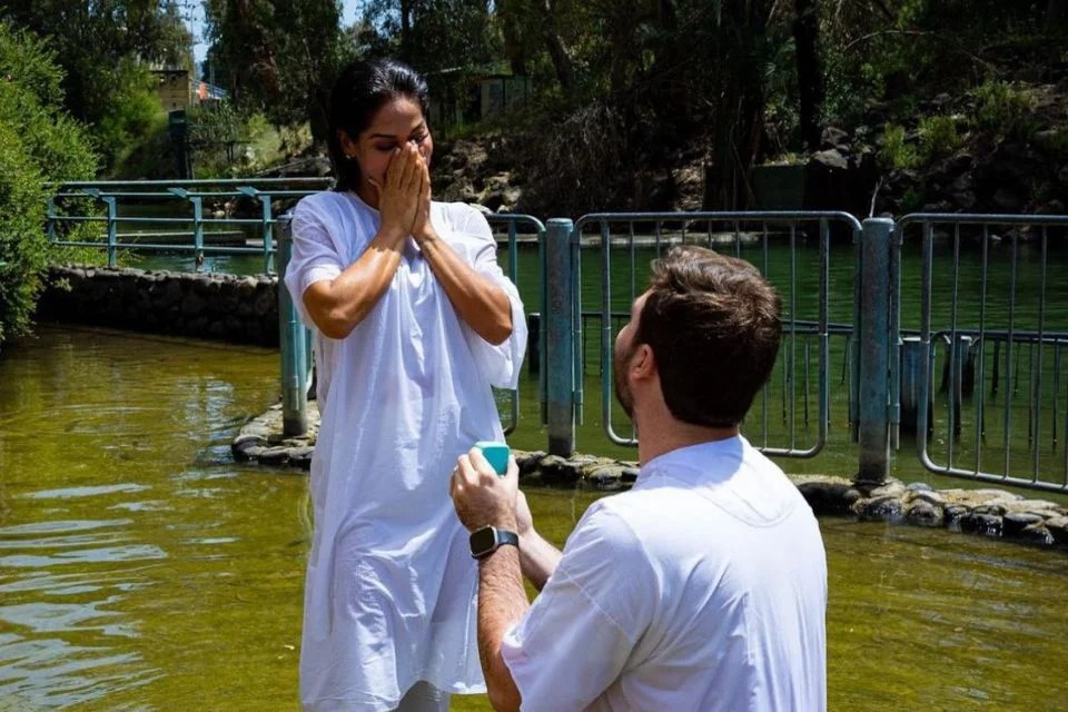 “Ainda emocionada e com o coração acelerado do batismo, as primeiras palavras que ouvi foram as suas, se declarando de uma forma mágica e única que jamais vivi. Terminando ajoelhado, com uma caixinha azul no Rio Jordão!”, completou.