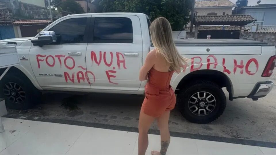 Na parte lateral do carro de Débora, uma frase escrita em letras grandes e spray vermelho dizia que “foto nua não é trabalho”. Na traseira do veículo, mais um ataque: “Puta lixo”.