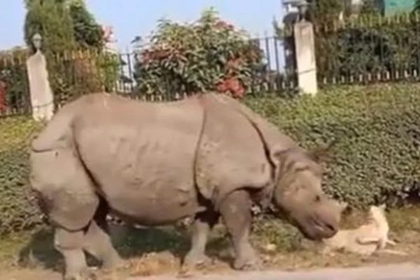 Vídeo de rinoceronte assustando cachorro em calçada viraliza na web