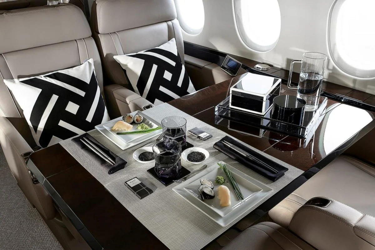 Por dentro, o avião se parece com uma sala de luxo. As poltronas são largas e podem ser deitadas completamente para virarem camas confortáveis durante o trajeto. O espaço ainda oferece internet de alta velocidade para o jogador trabalhar ou se distrair.