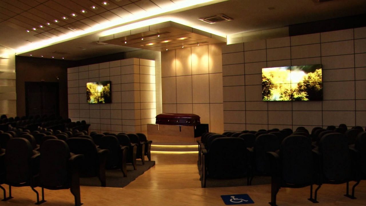 Após o velório, o caixão é levado para o auditório do crematório. Lá ele é disposto sobre uma mesa elevatória. No ambiente há dois telões onde podem ser expostas fotos e vídeos do falecido.