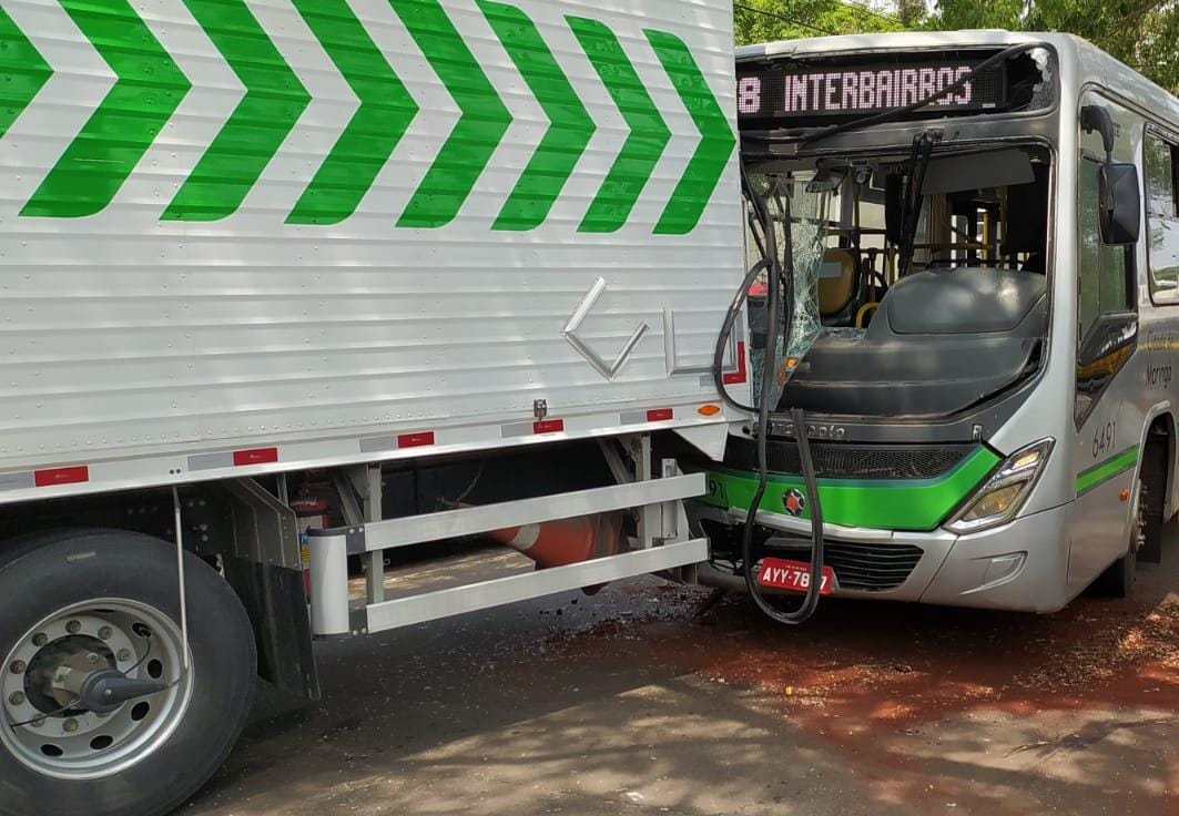 O para-brisa do ônibus do transporte coletivo ficou completamente destruído. As causas da batida entre os dois veículos serão apuradas.