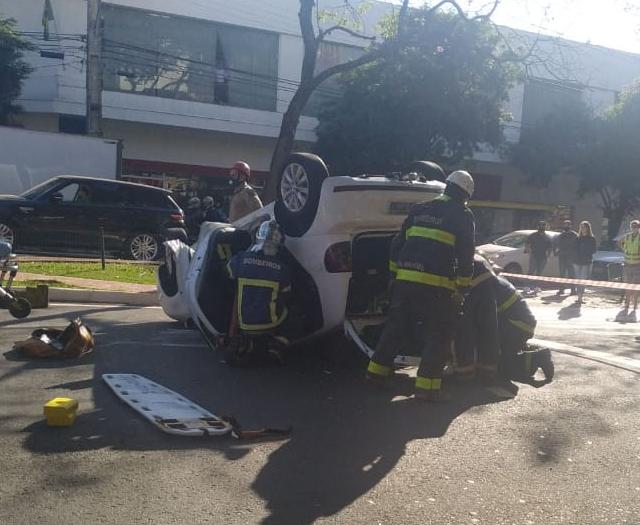 Um automóvel capotou após colidir com outro veículo.