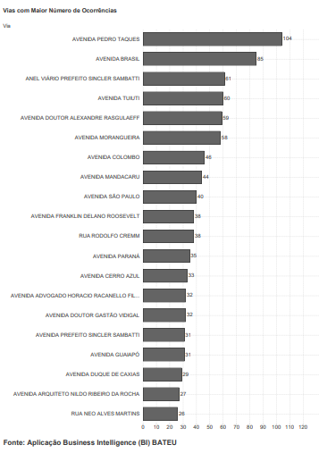 Em segundo lugar, com 85 registros, está a Avenida Brasil. Os trechos do Anel Viário Prefeito Sincler Sambatti, da Avenida Tuiuti, da Avenida Doutor Alexandre Rasgulaeff e da Avenida Morangueira aparecem logo em seguida, quase empatados, com 61, 60, 59 e 58 registros de acidentes, respectivamente.