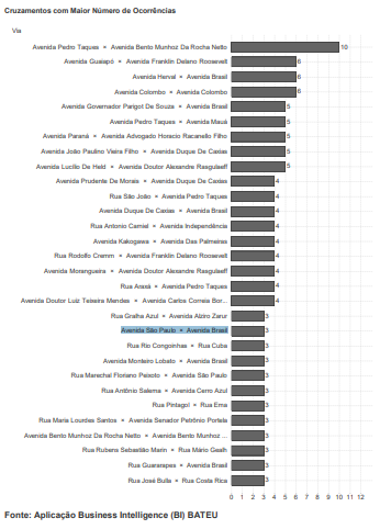 Entre os cruzamentos com maior número de acidentes, segundo os dados do Detran, a Avenida Pedro Taques aparece novamente em destaque. O cruzamento da via com a Avenida Bento Munhoz Da Rocha Netto teve o total de 10 acidentes registrados no período.