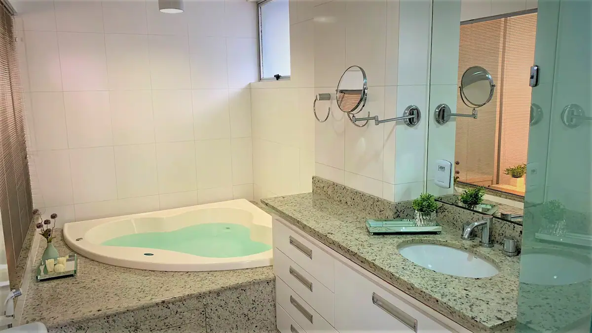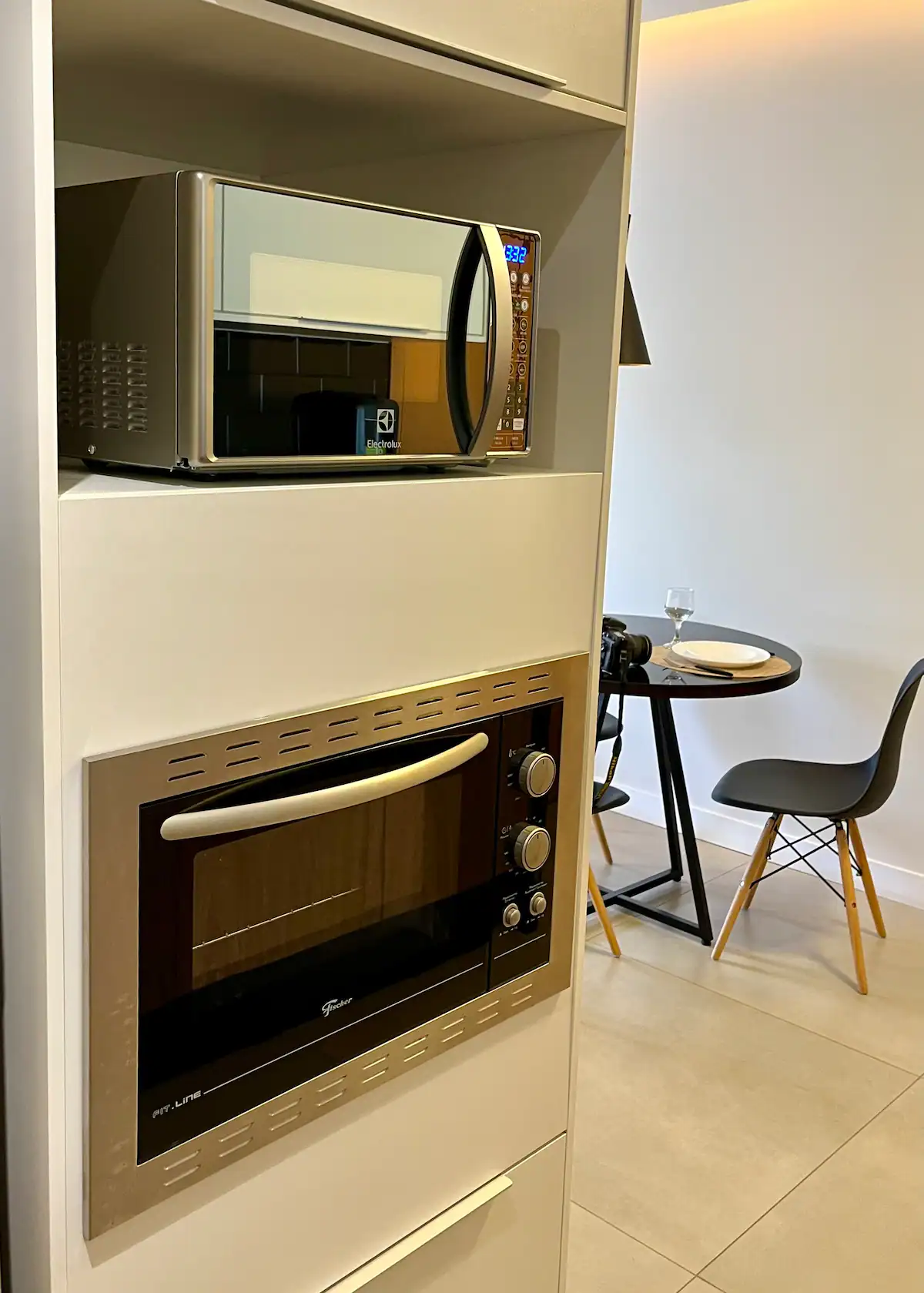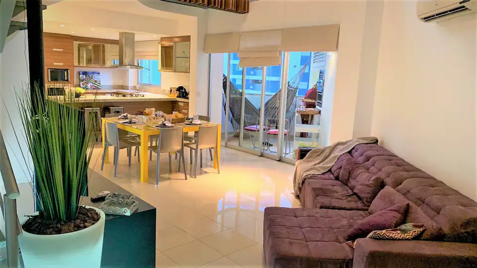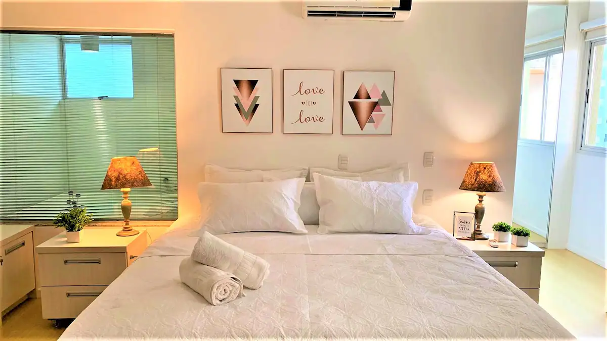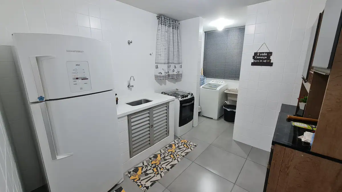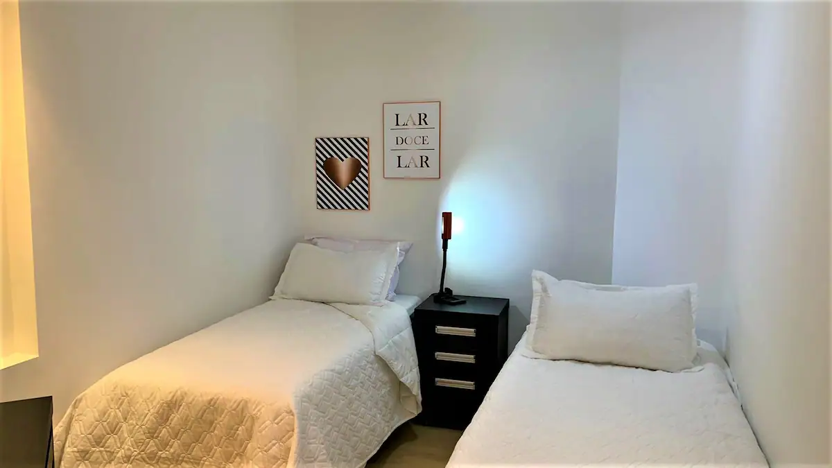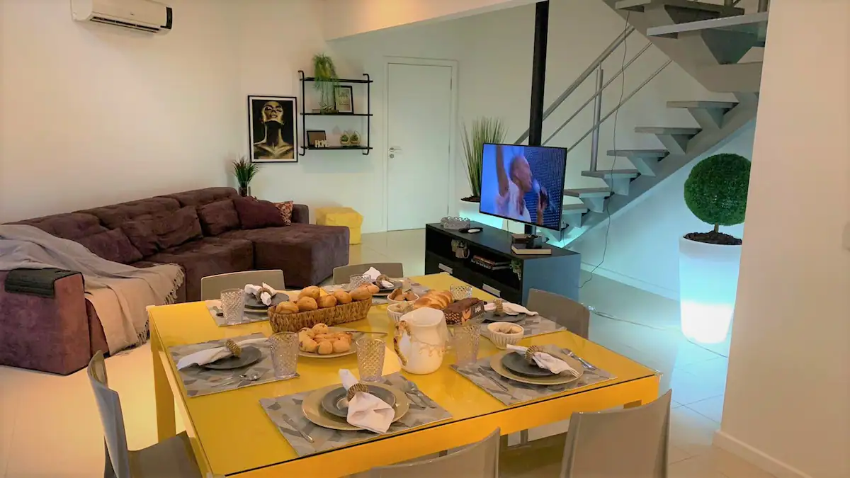 O apartamento é um duplex com sala de tv (smart) com sofá cama, mesa jantar, cozinha, varanda, área de serviço, um quarto (duas camas de solteiro) e uma suíte (cama king e banheira), dois banheiros (um na suíte e outro no primeiro andar). Tem televisão, geladeira, fogão, micro-ondas e utensílios de cozinha, além de ar-condicionado na suíte e na sala.