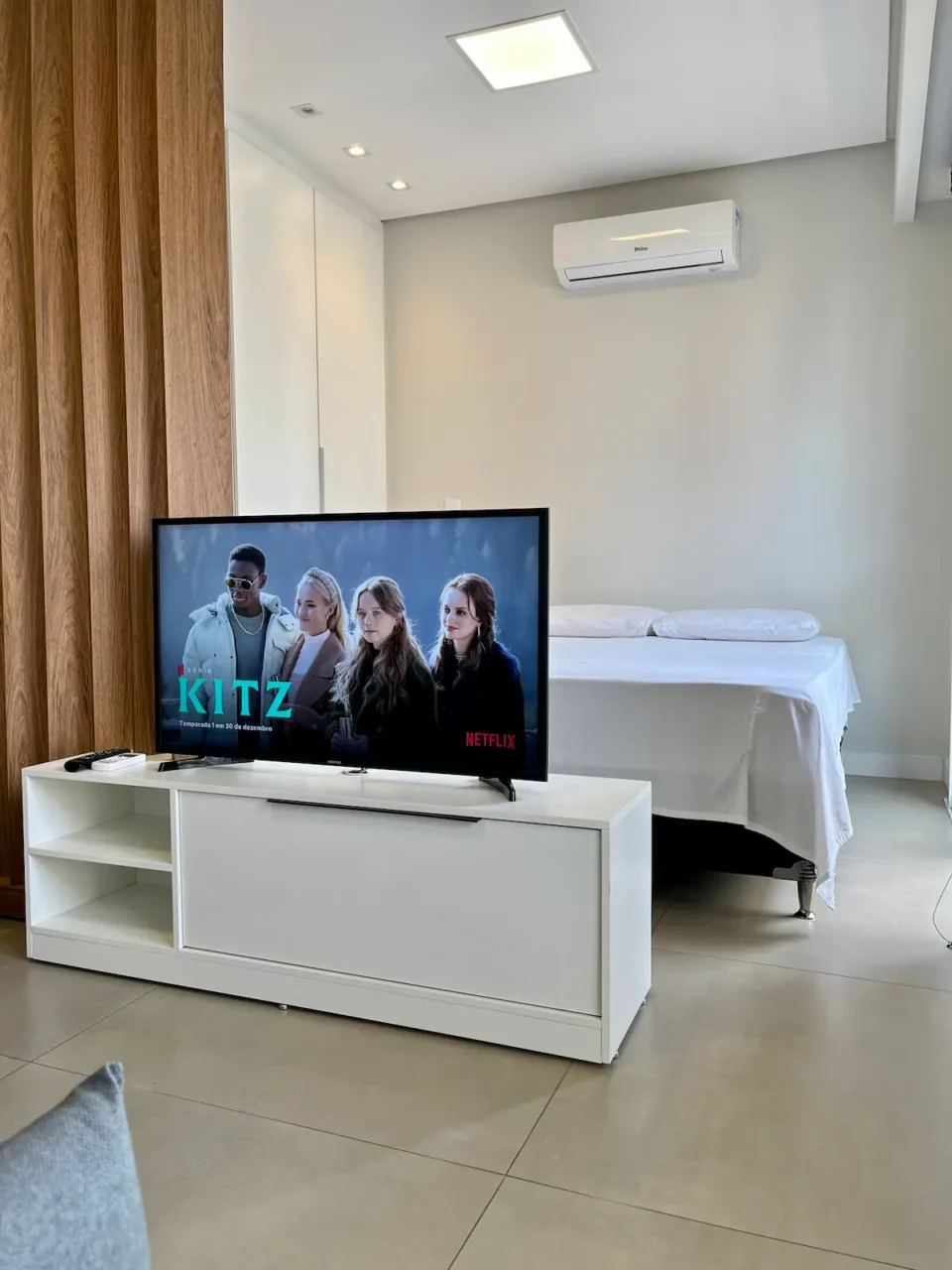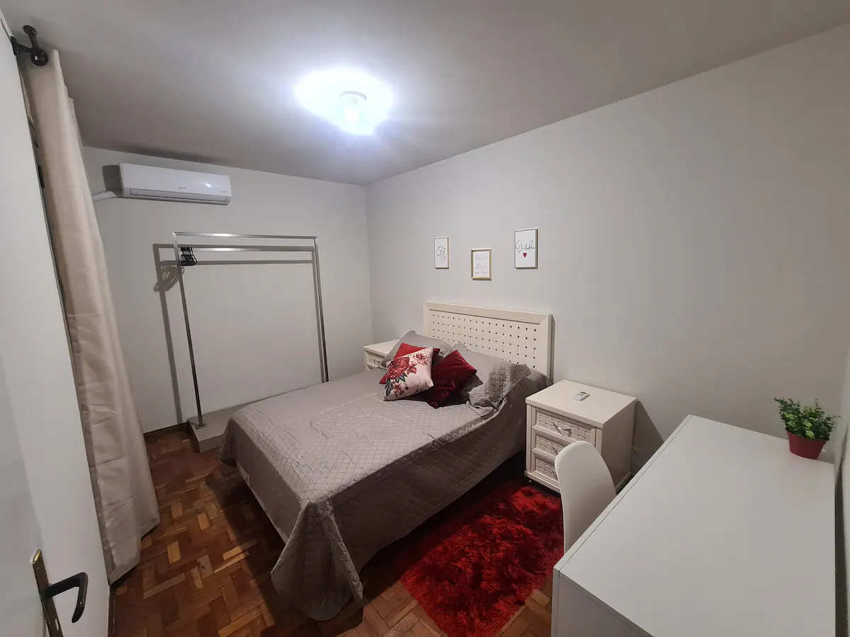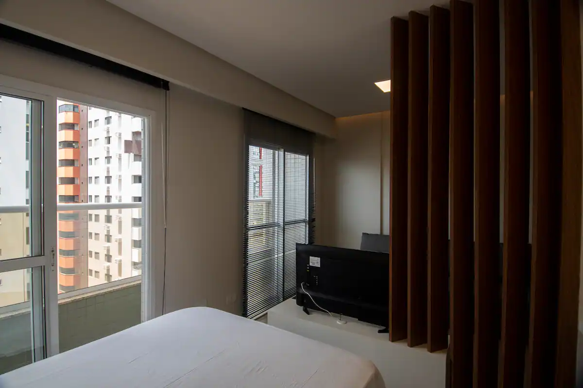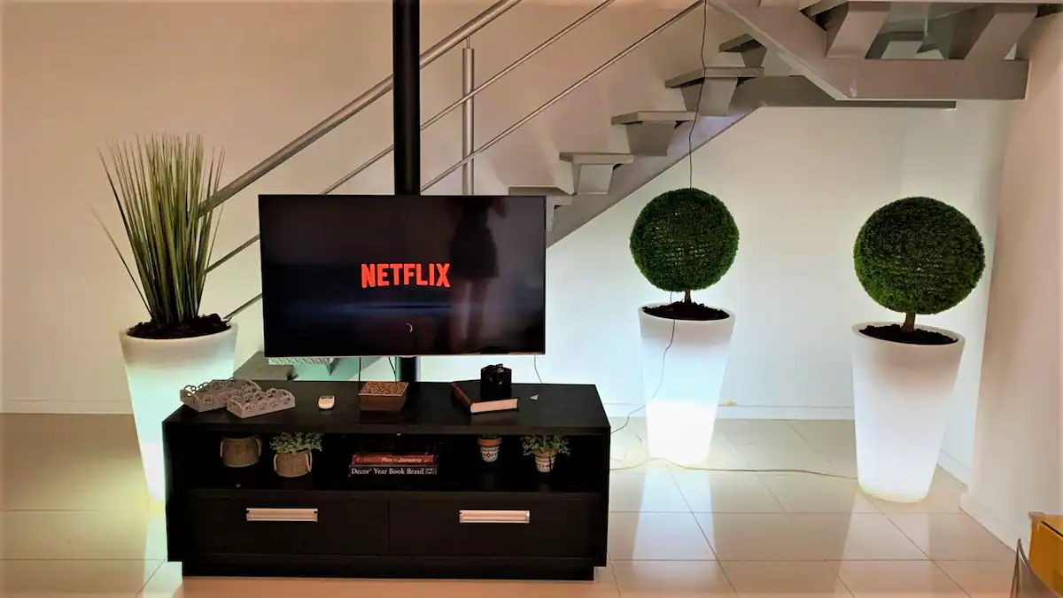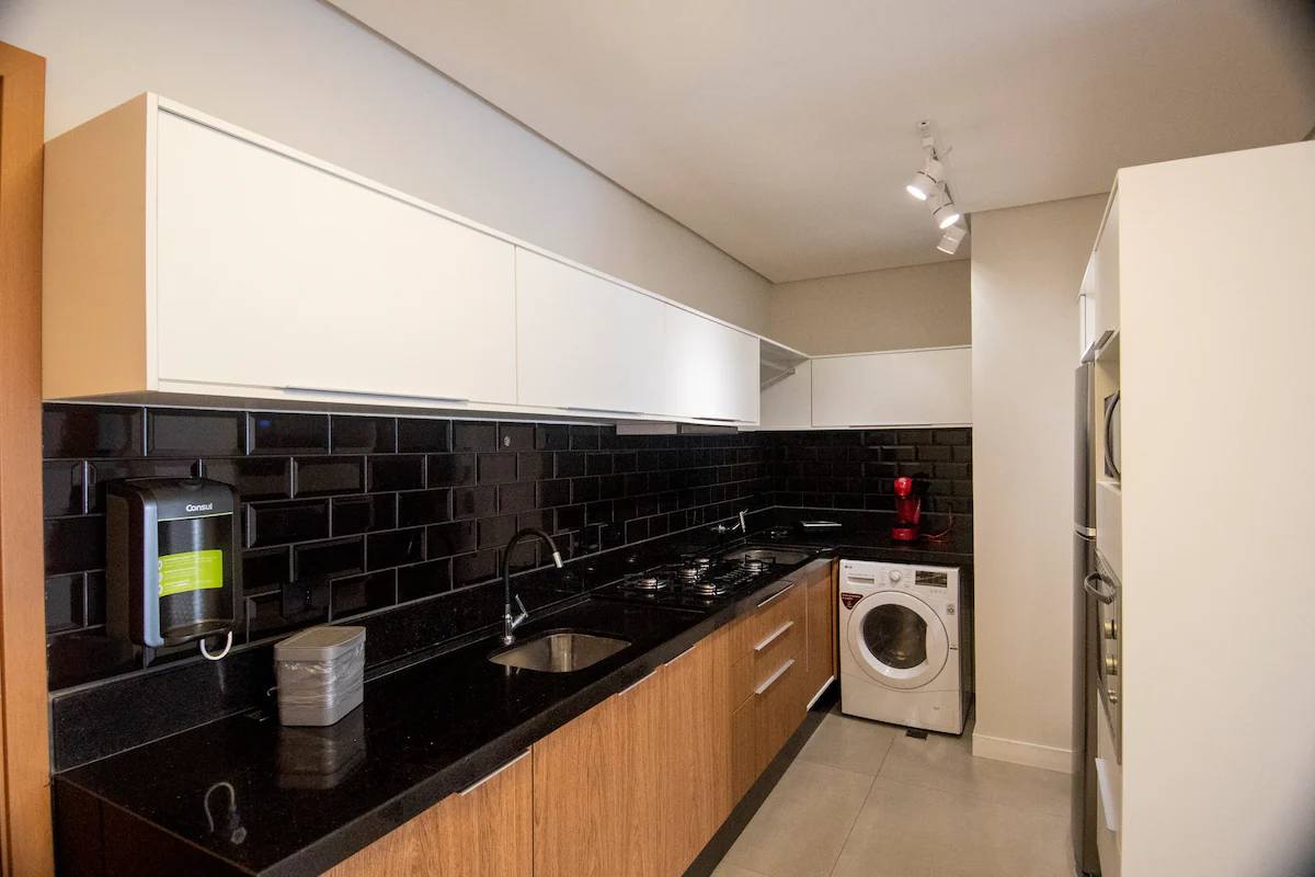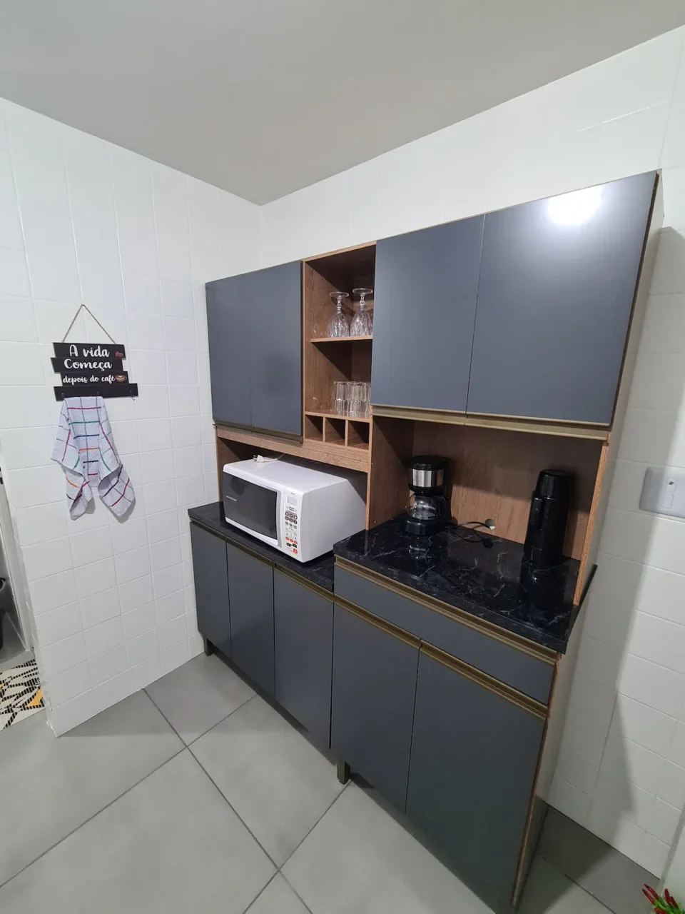 O apartamento é um duplex com sala de tv (smart) com sofá cama, mesa jantar, cozinha, varanda, área de serviço, um quarto (duas camas de solteiro) e uma suíte (cama king e banheira), dois banheiros (um na suíte e outro no primeiro andar). Tem televisão, geladeira, fogão, micro-ondas e utensílios de cozinha, além de ar-condicionado na suíte e na sala.