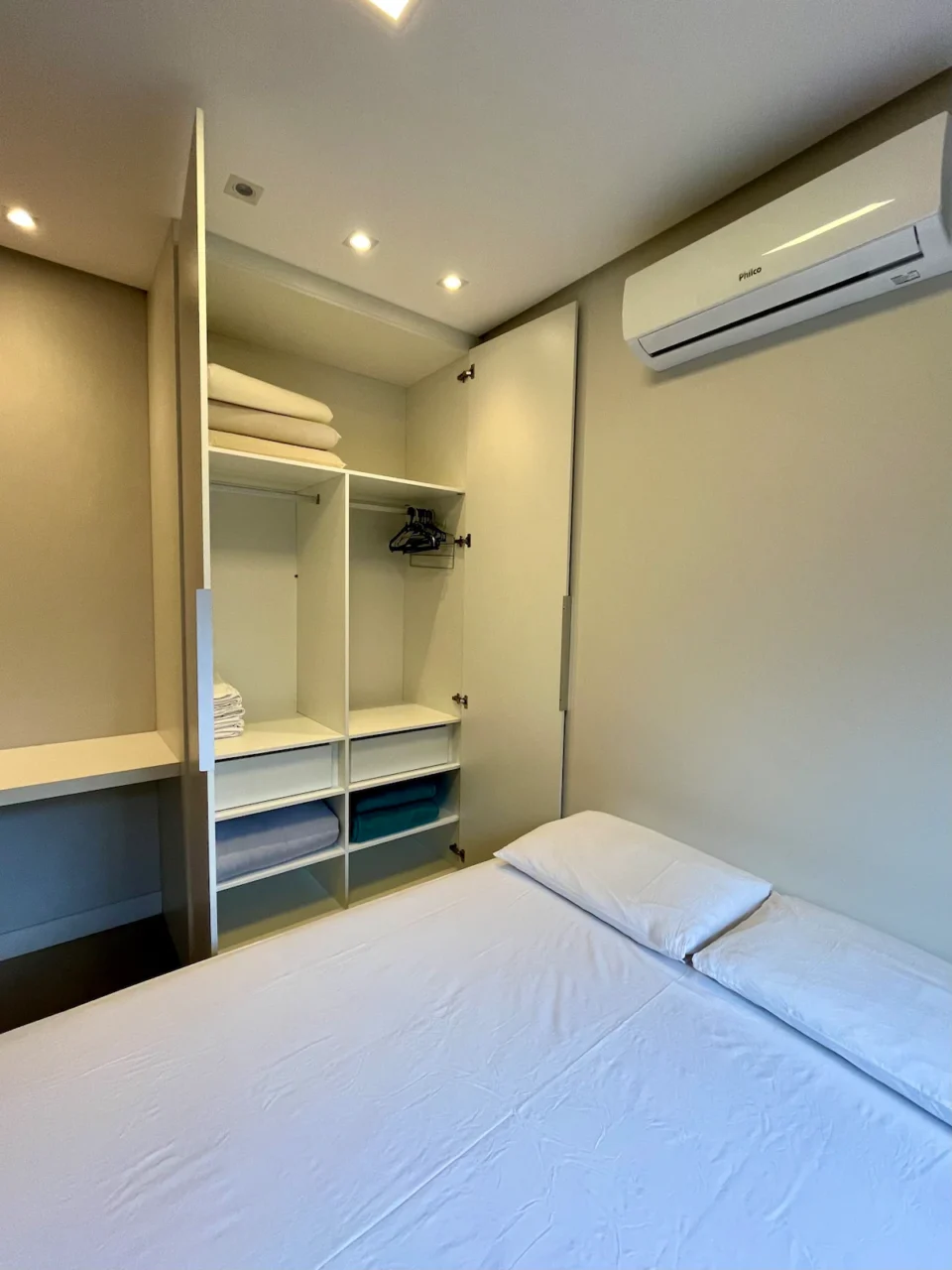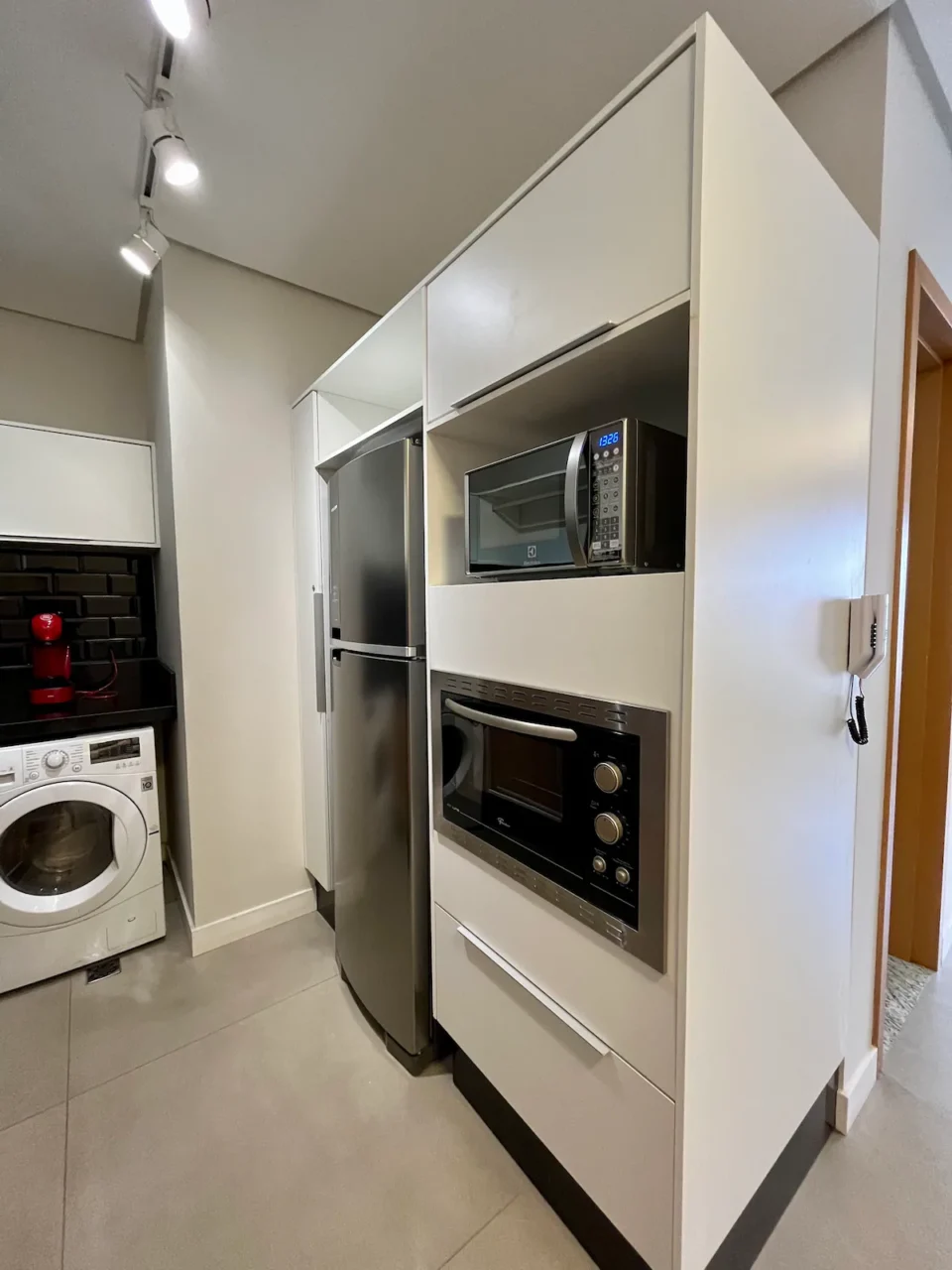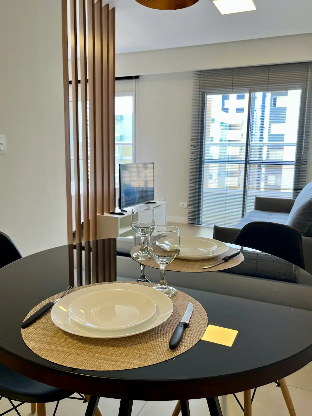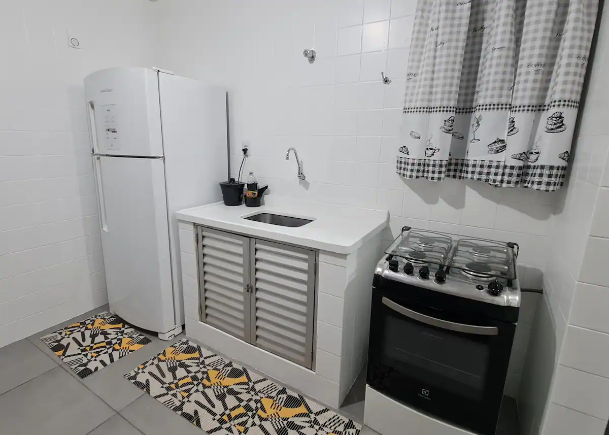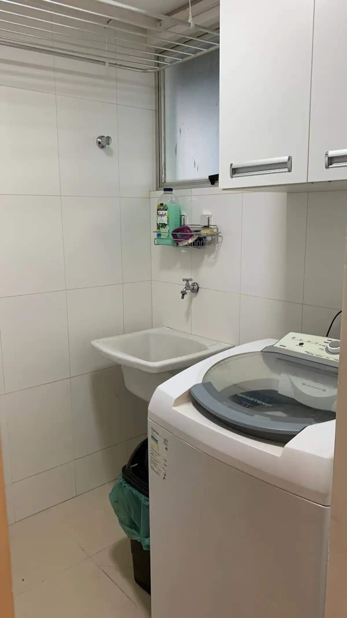 O apartamento é um duplex com sala de tv (smart) com sofá cama, mesa jantar, cozinha, varanda, área de serviço, um quarto (duas camas de solteiro) e uma suíte (cama king e banheira), dois banheiros (um na suíte e outro no primeiro andar). Tem televisão, geladeira, fogão, micro-ondas e utensílios de cozinha, além de ar-condicionado na suíte e na sala.