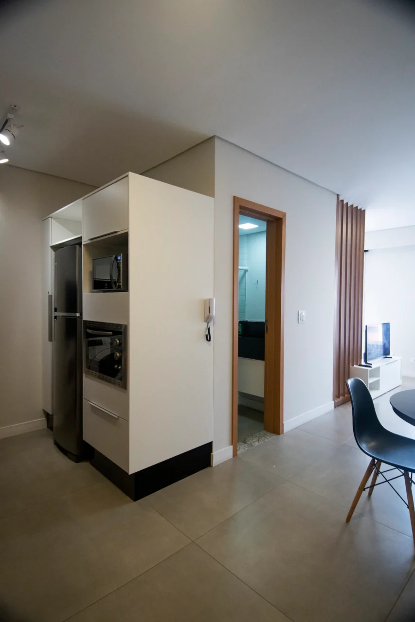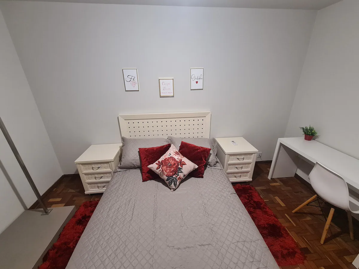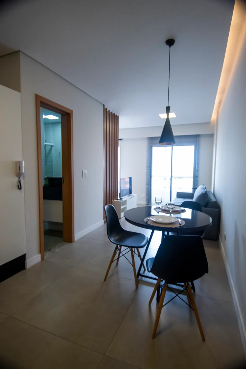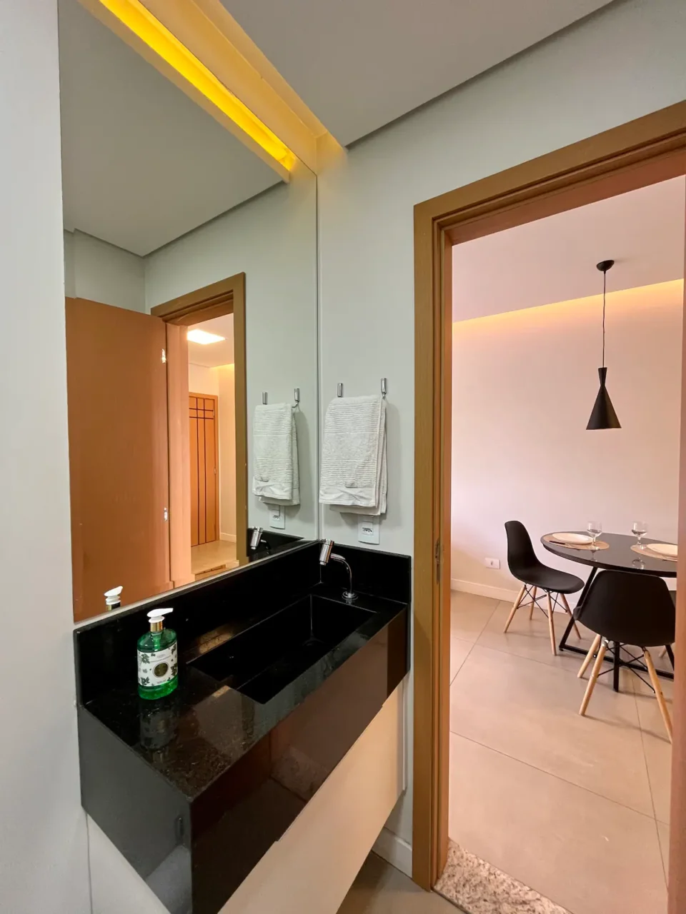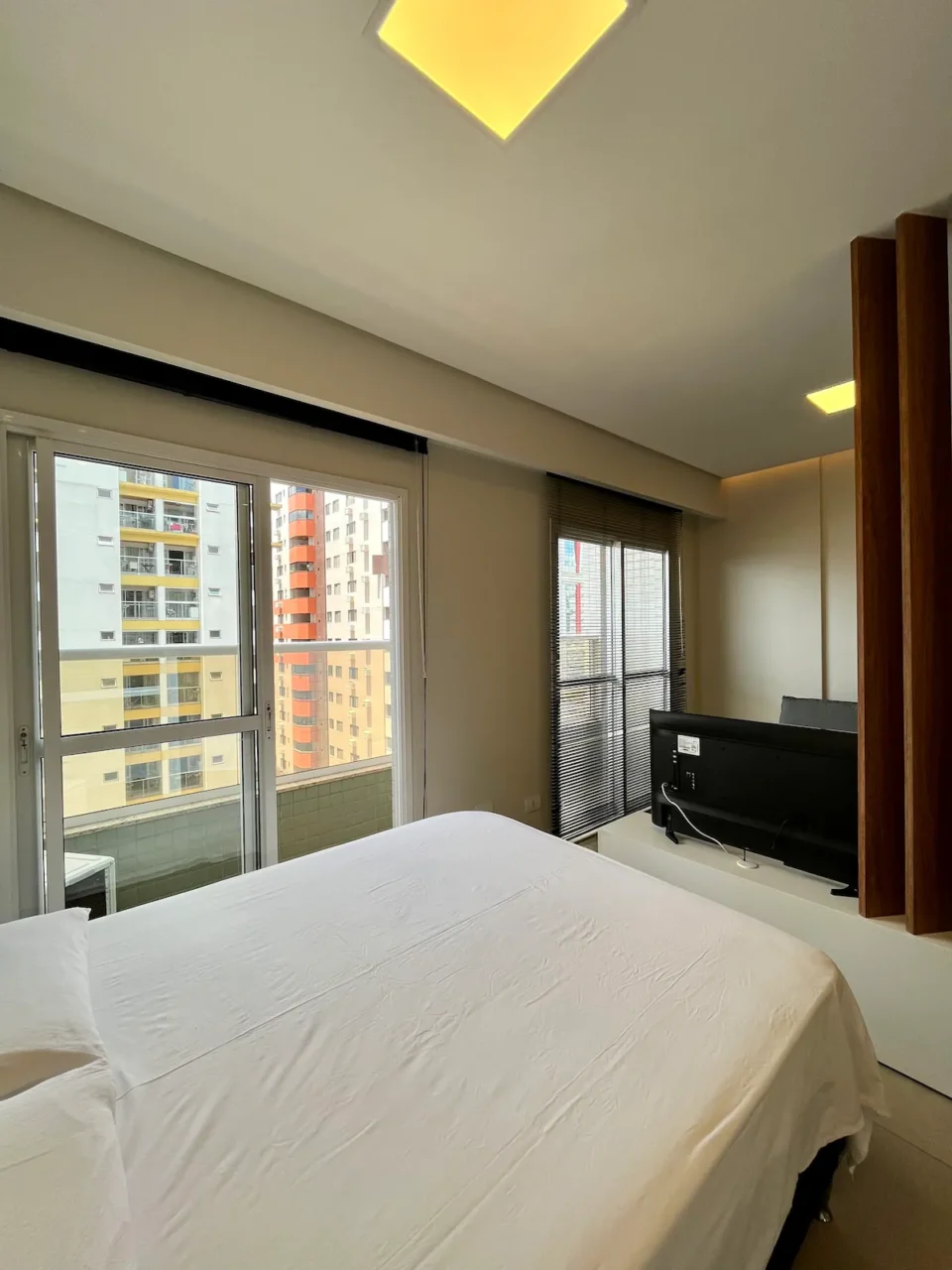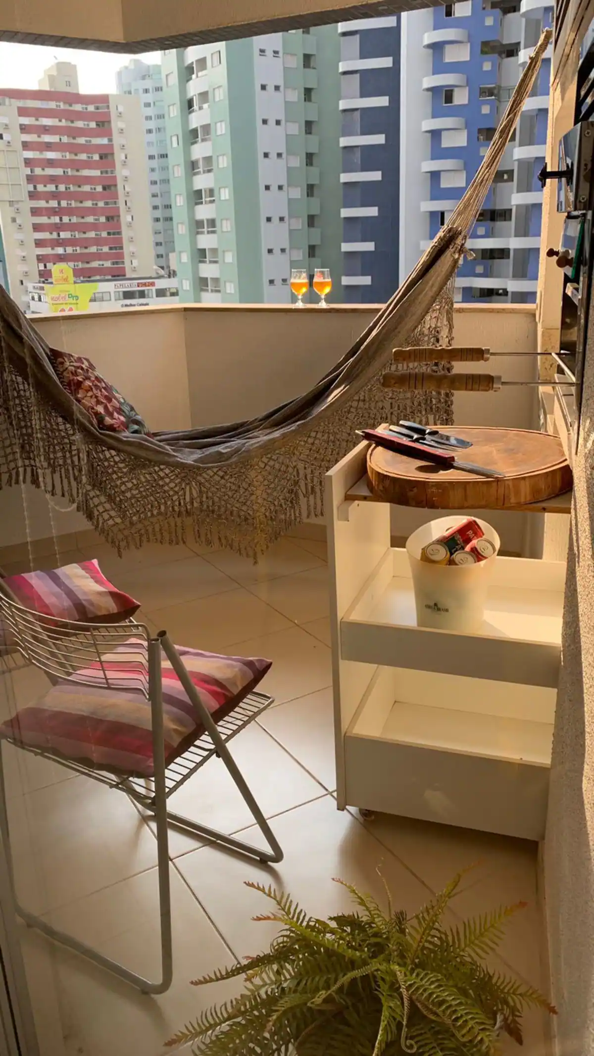O apartamento é um duplex com sala de tv (smart) com sofá cama, mesa jantar, cozinha, varanda, área de serviço, um quarto (duas camas de solteiro) e uma suíte (cama king e banheira), dois banheiros (um na suíte e outro no primeiro andar). Tem televisão, geladeira, fogão, micro-ondas e utensílios de cozinha, além de ar-condicionado na suíte e na sala.