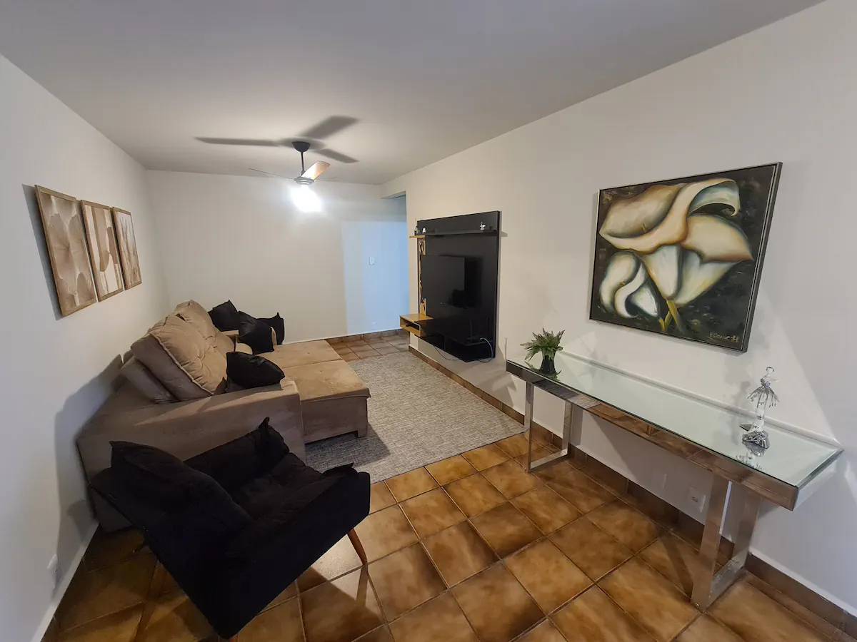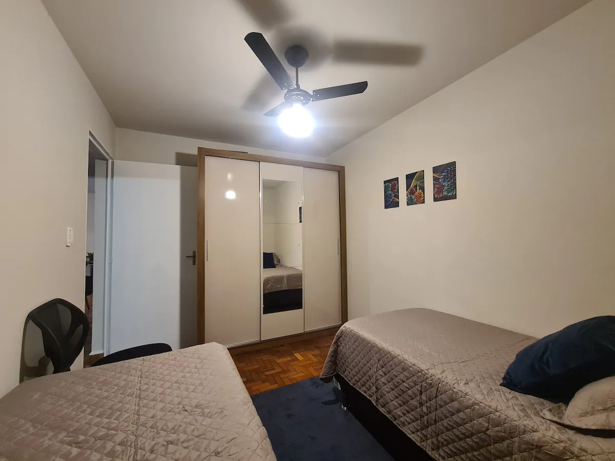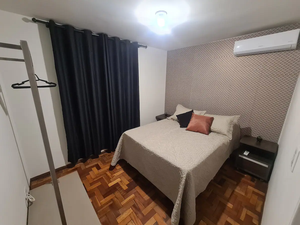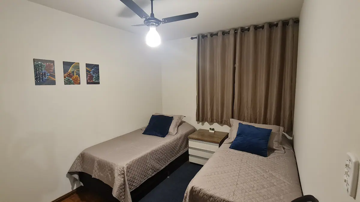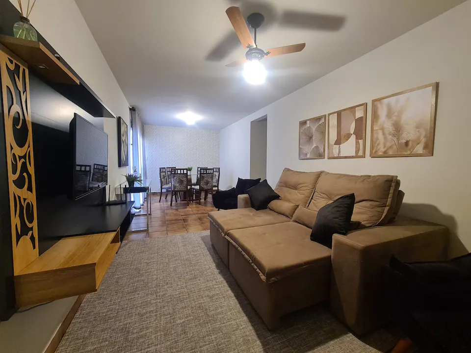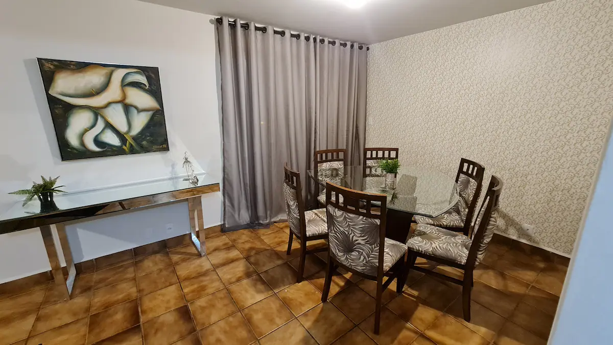 Também localizado no centro, na zona 1, este apartamento tem valor de R$ 140 por noite e conta com 3 quartos, sendo dois com ar-condicionado, e um com ventilador de teto. A sala é ampla, com dois ambientes, com sofá e duas poltronas, mesa de jantar com seis cadeiras, internet fibra óptica 300 mega e televisão com todos os canais.