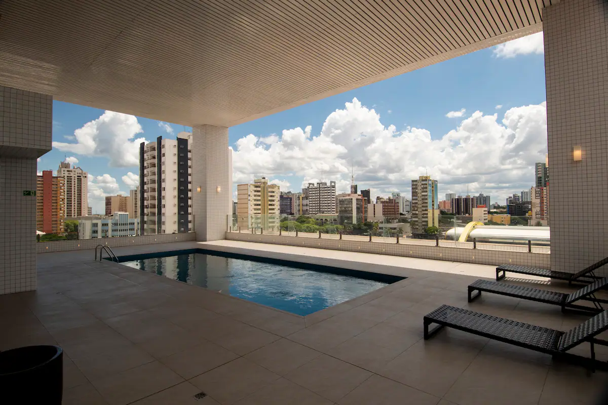 O local oferece 41 comodidades, que incluem vista para o horizonte da cidade; cozinha, wi-fi, espaço de trabalho exclusivo, estacionamento gratuito em garagem na propriedade, piscina compartilhada externa disponível o ano todo e durante 24 horas, piscina de natação, jacuzzi privativa e permissão para levar animais.