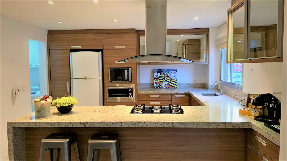 O local oferece 33 comodidades, que incluem cozinha, wi-fi, espaço de trabalho exclusivo, estacionamento incluído; permissão para levar animais, HDTV com Netflix, elevador e máquina de lavar.