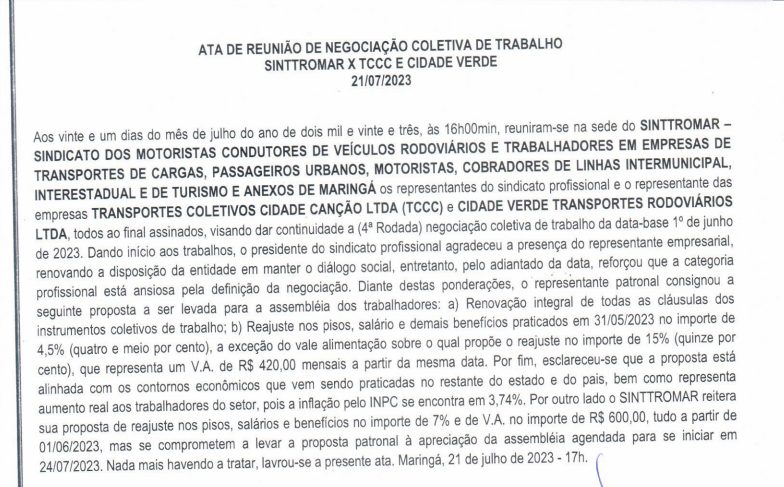 Em documento divulgado na última sexta-feira, 21, a ata de reunião entre o sindicato e as empresas informa que o Sinttromar levará aos motoristas a proposta das empresas TCCC e TCVC para apreciação da categoria. Confira o documento na íntegra.