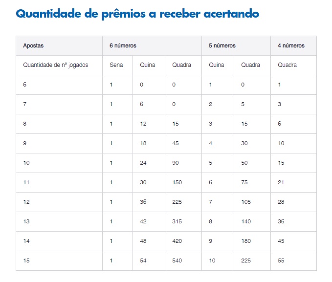 A Caixa Econômica Federal exemplifica as normas em uma tabela disponibilizada no site da instituição. Jogos com sete ou mais dezenas vão gerar um maior faturamento para o ganhador caso ele acerte quatro, cinco ou seis números.