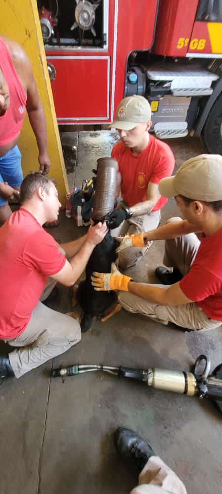 No Quartel do Corpo de Bombeiros, a guarnição utilizou equipamentos de desencarceramento, usualmente aplicados no resgate de vítimas presas às ferragens. Com a criação de espaço, os profissionais precisaram de detergente, água e muita paciência para conseguirem libertar a cadelinha aventureira.