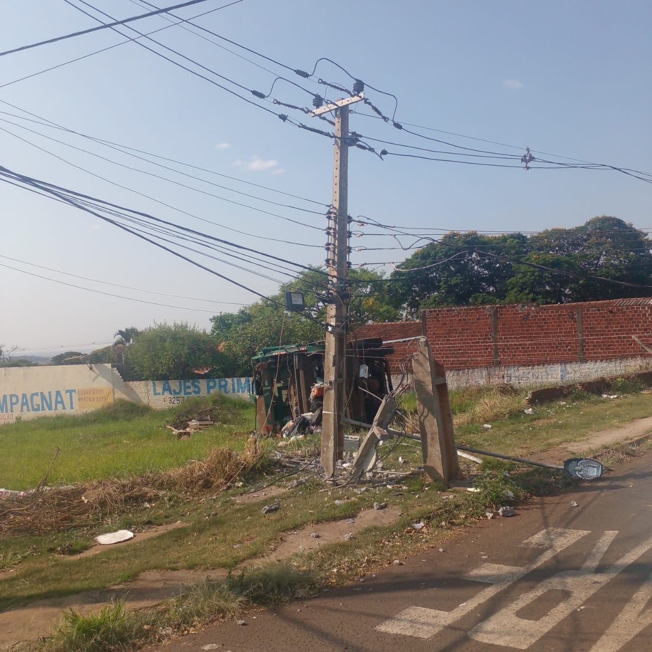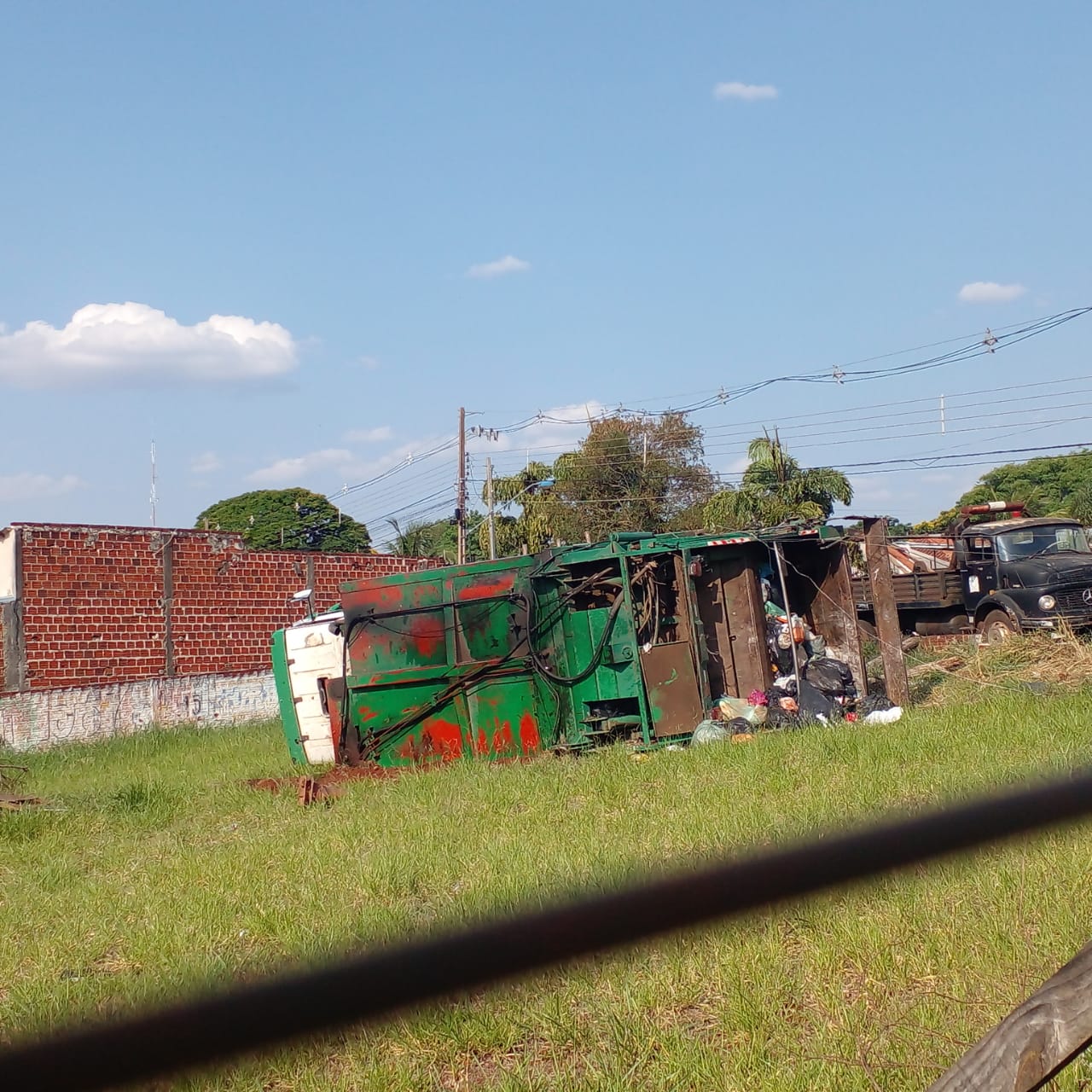 O caminhão atingiu um poste da rede de energia elétrica e depois tombou. O motorista é servidor da Prefeitura de Maringá e está bem. As equipes de resgate foram para o local, mas ele teria recusado atendimento. O caminhão ficou tombado no terreno vazio.